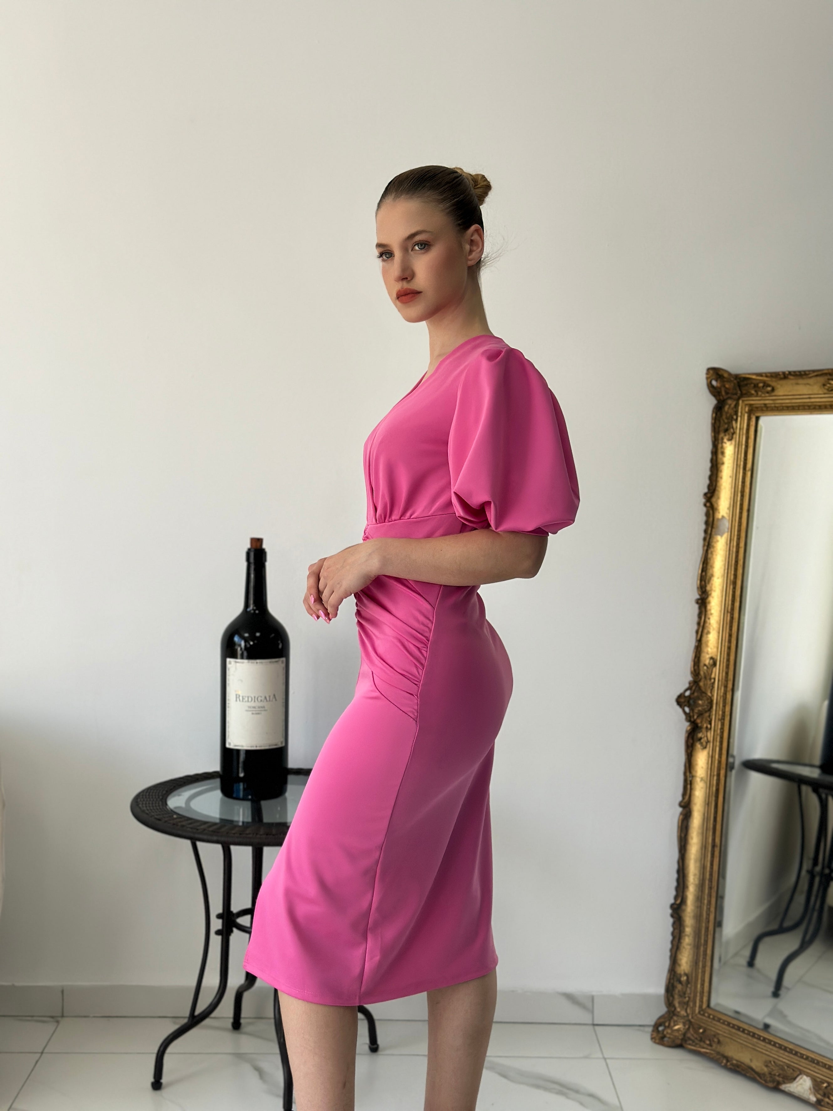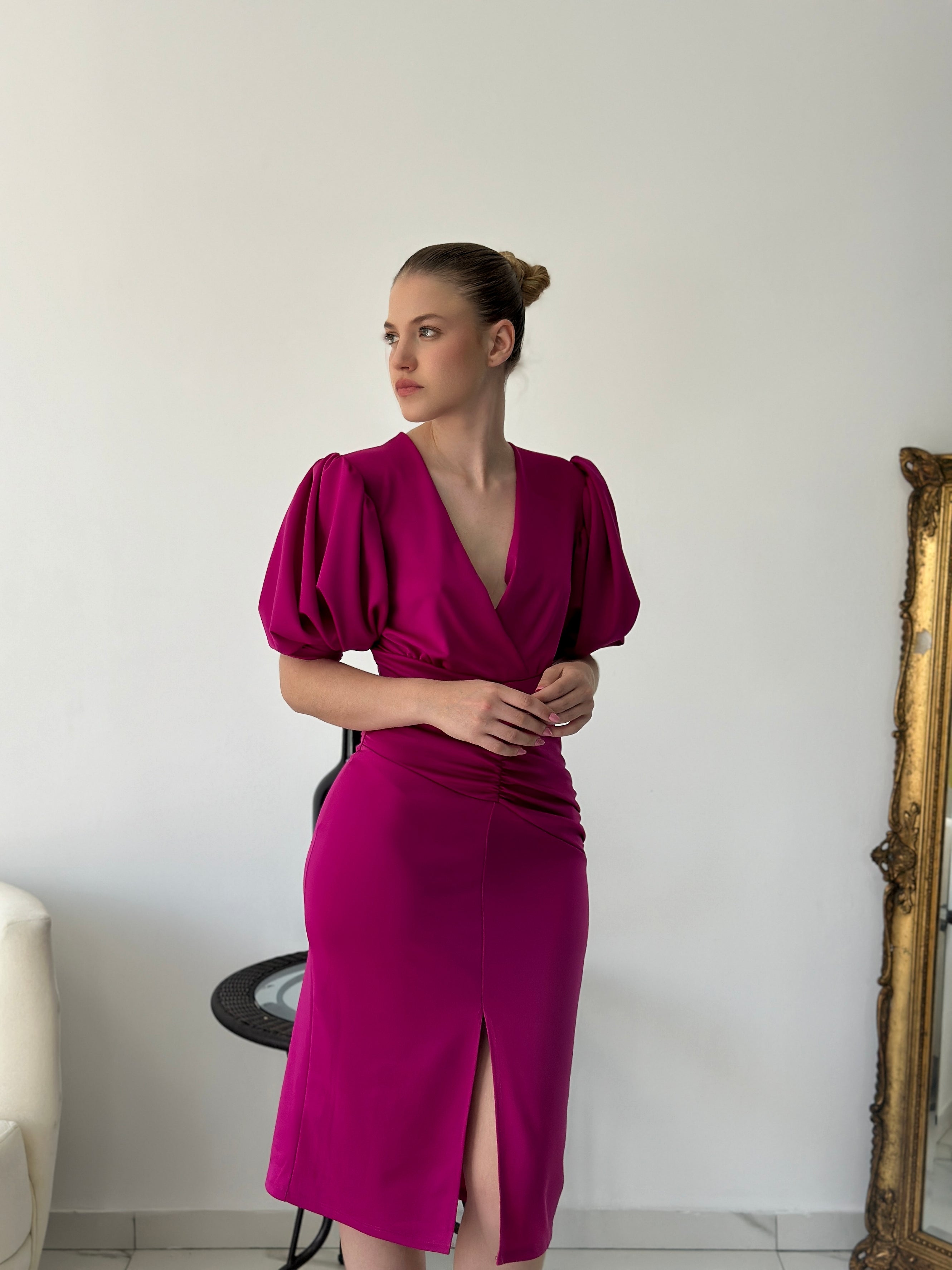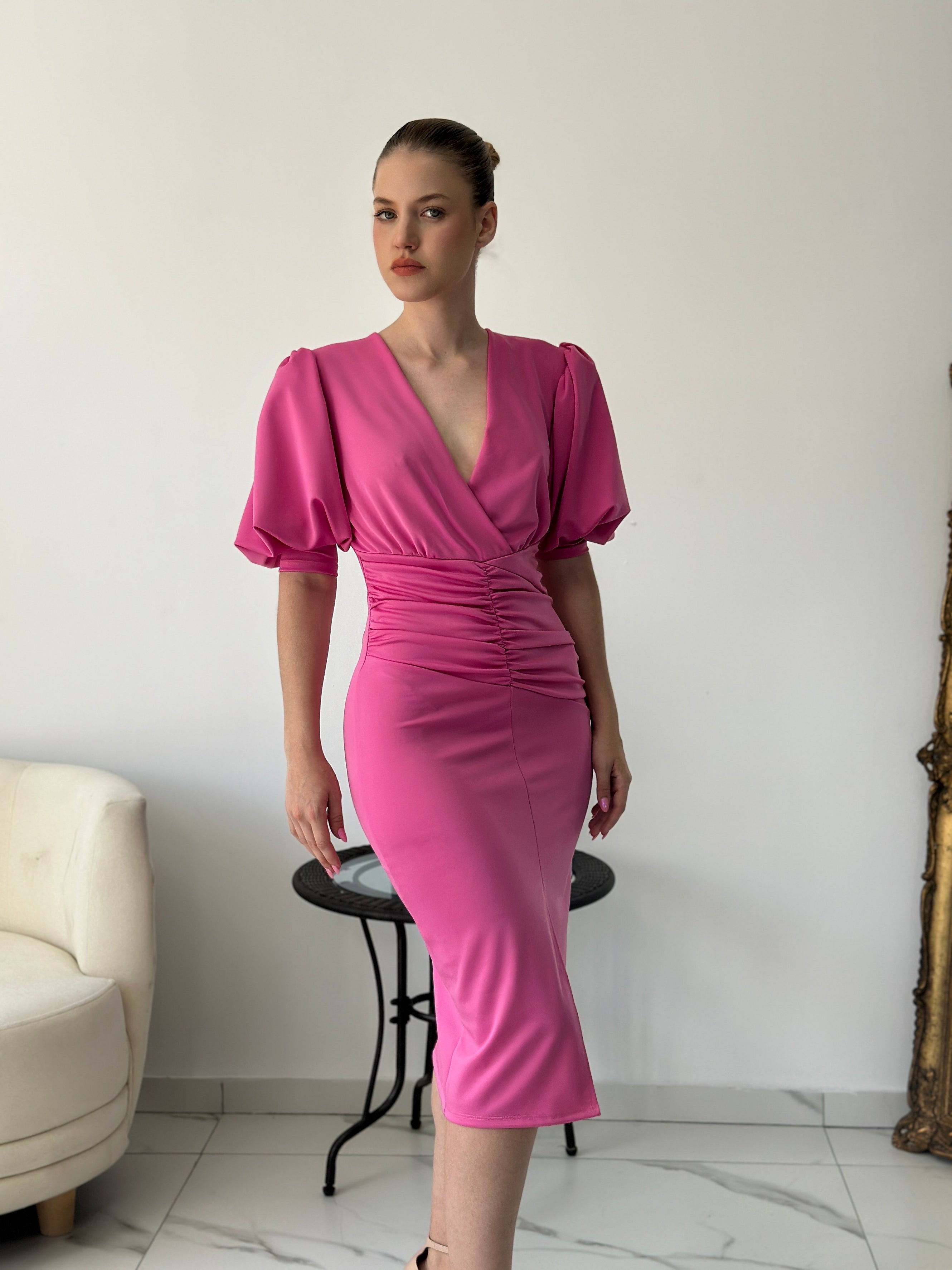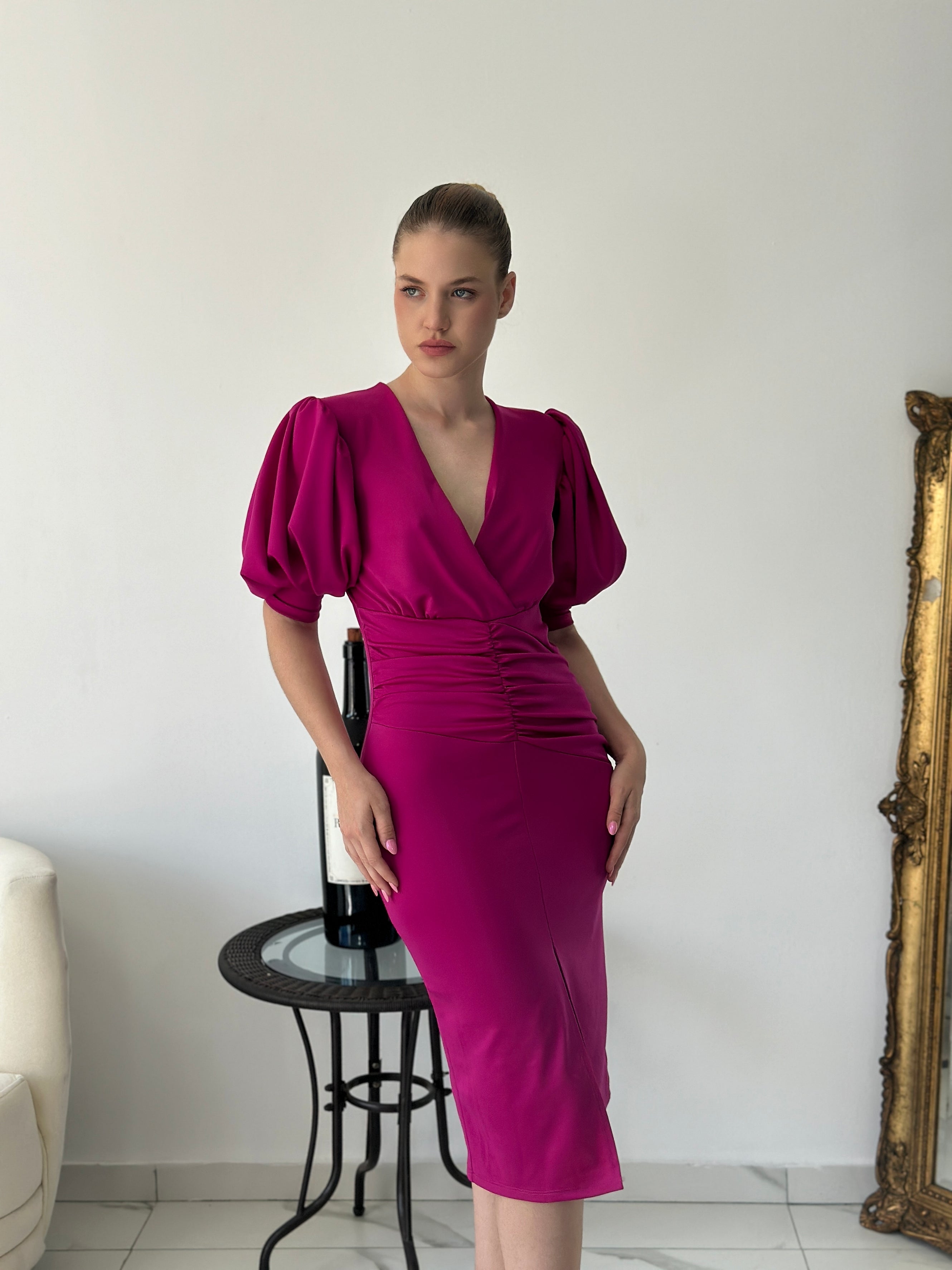 El vestido Elegancia Carmesí captura la esencia del refinamiento con su silueta midi y detalles cuidadosamente pensados. Este vestido en un tono rojo carmesí radiante es la definición de sofisticación, también disponible en otros colores. Con un diseño de ruching que adula la figura y mangas cortas fluidas que aportan un aire de gracia, es ideal para eventos de negocios o cócteles elegantes.