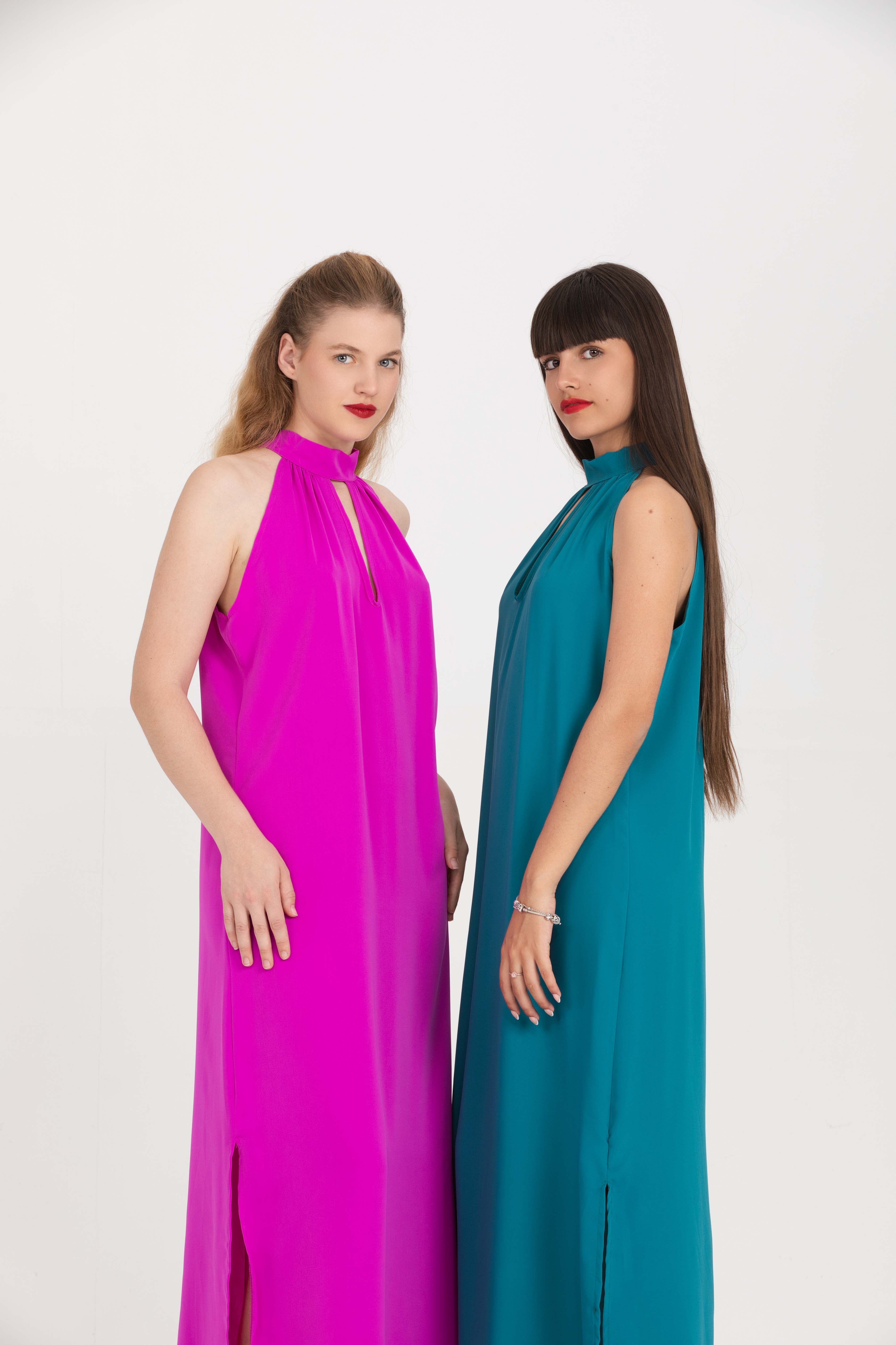 Una prenda esencial para cualquier evento formal. Con un sofisticado diseño halter y una abertura discreta en la parte delantera, este vestido largo está confeccionado en un tejido fluido que cae elegantemente, brindando un movimiento natural y cómodo.