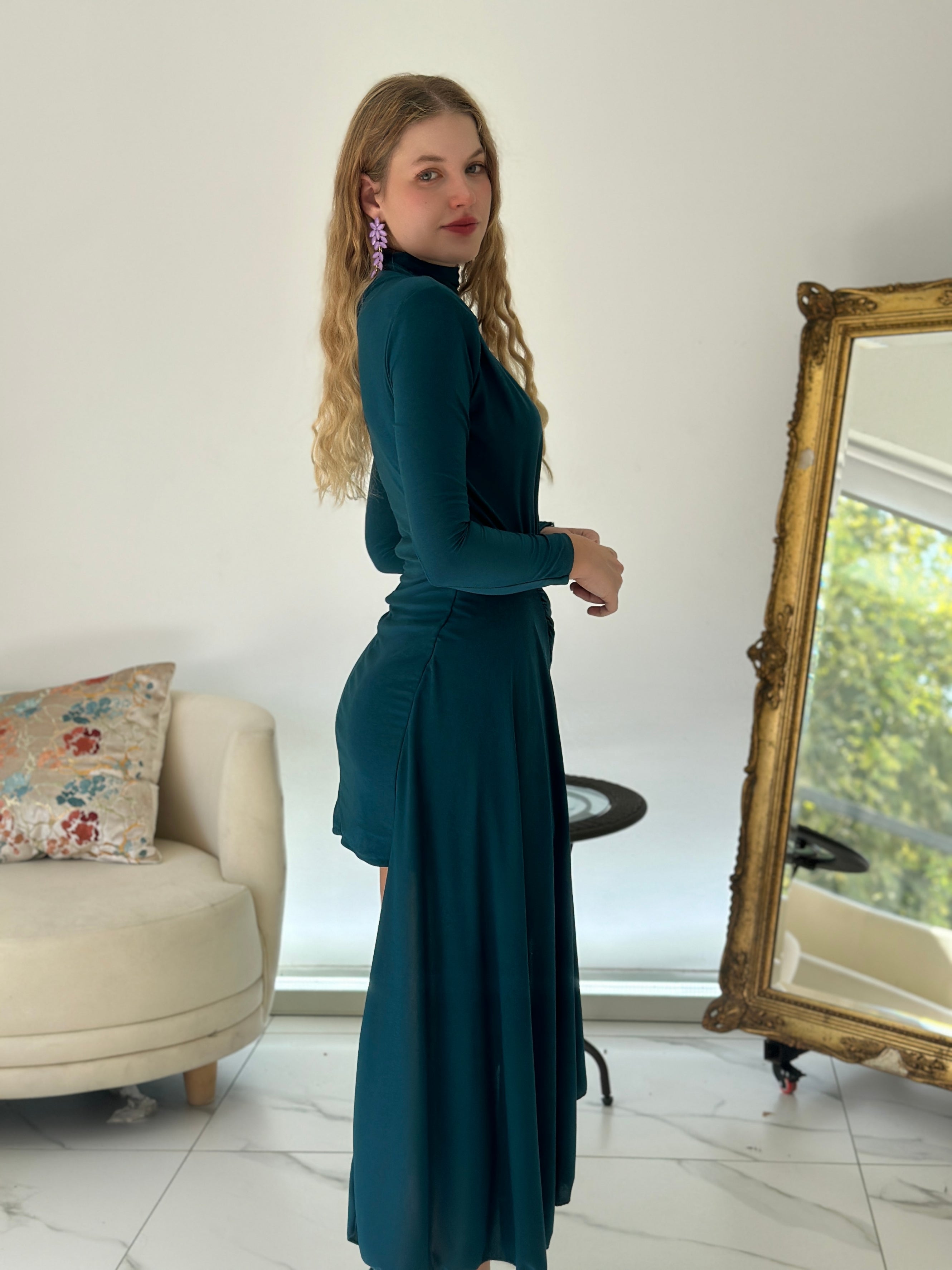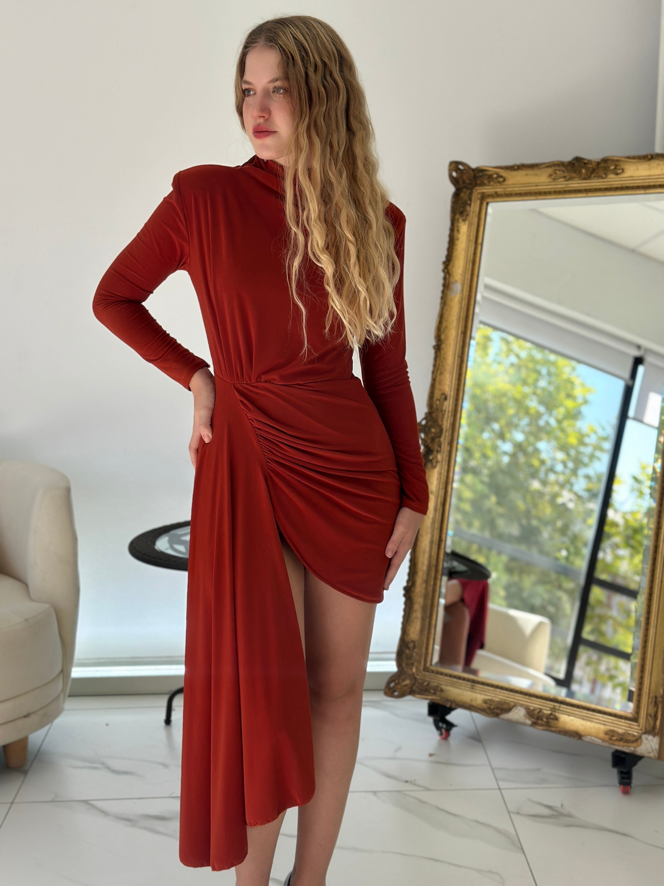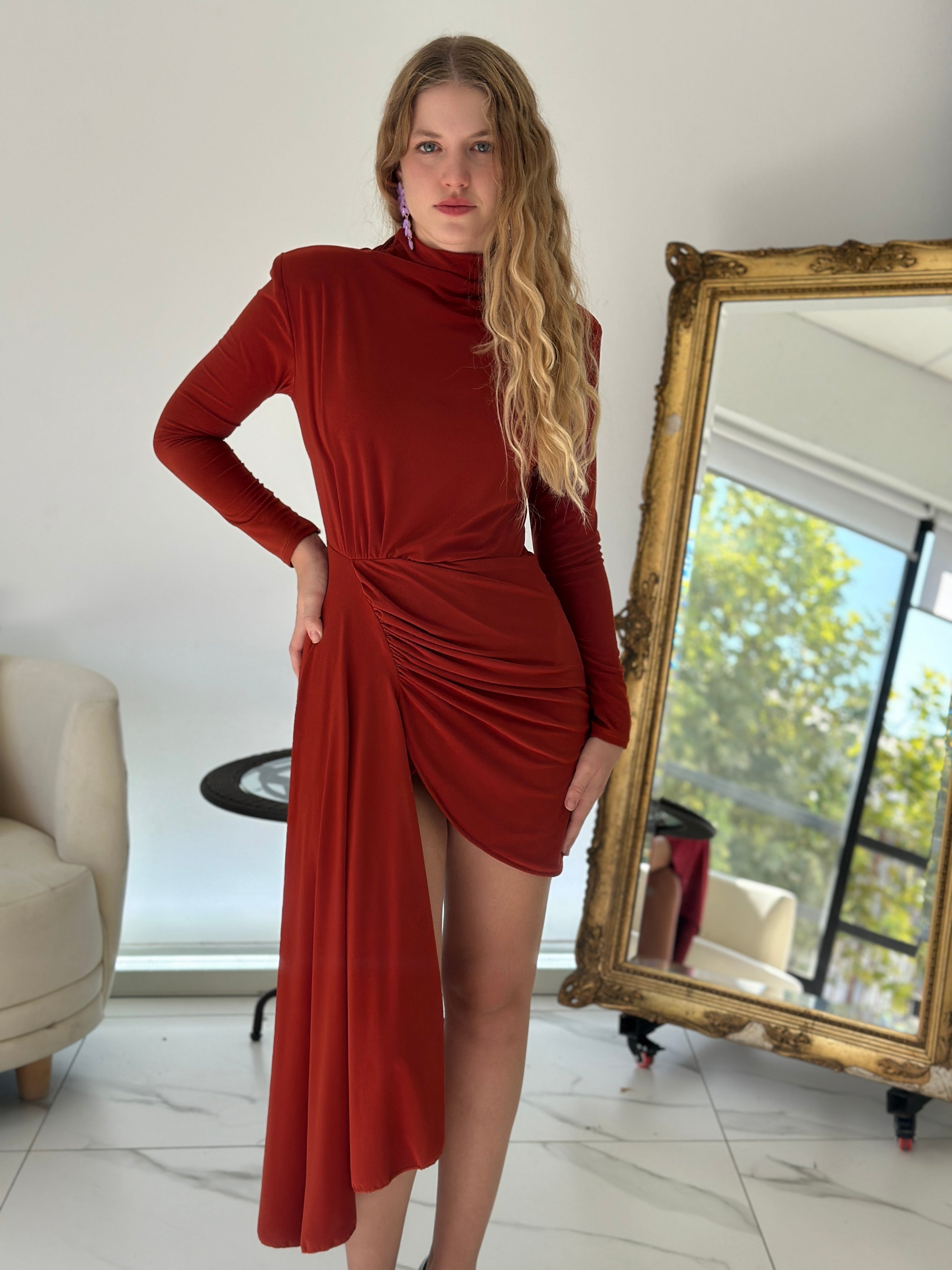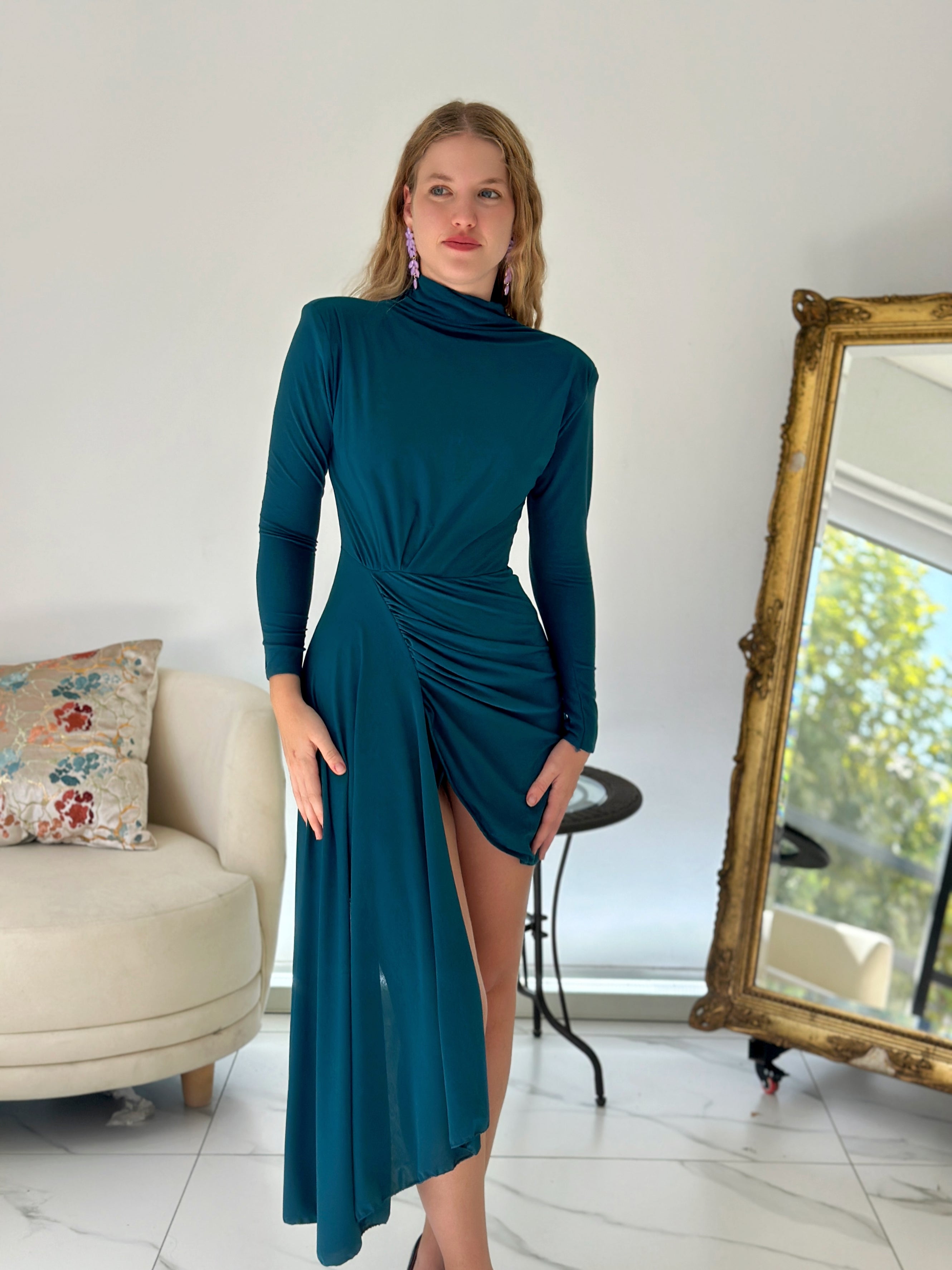 El vestido Diva Cola Asimétrica es una prenda de alto impacto que destaca por su diseño audaz y elegante. Su estructura asimétrica combina una silueta ajustada en la parte superior con un faldón dramático que aporta un movimiento fluido y sofisticado. La prenda cuenta con un cuello alto que eleva la sofisticación, mientras que la abertura lateral añade un toque sensual. Su estilo de manga larga lo convierte en una opción versátil para eventos tanto diurnos como nocturnos.