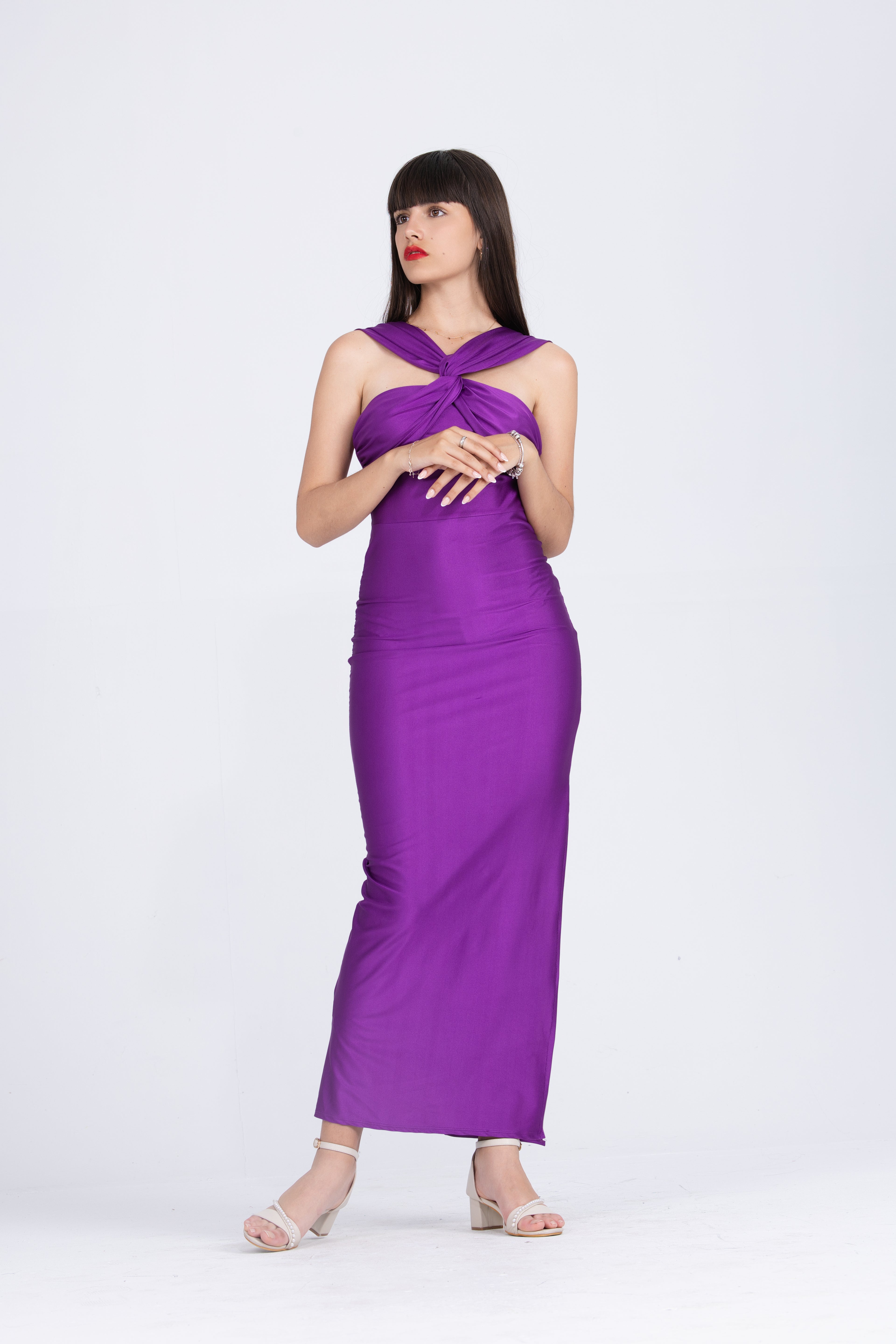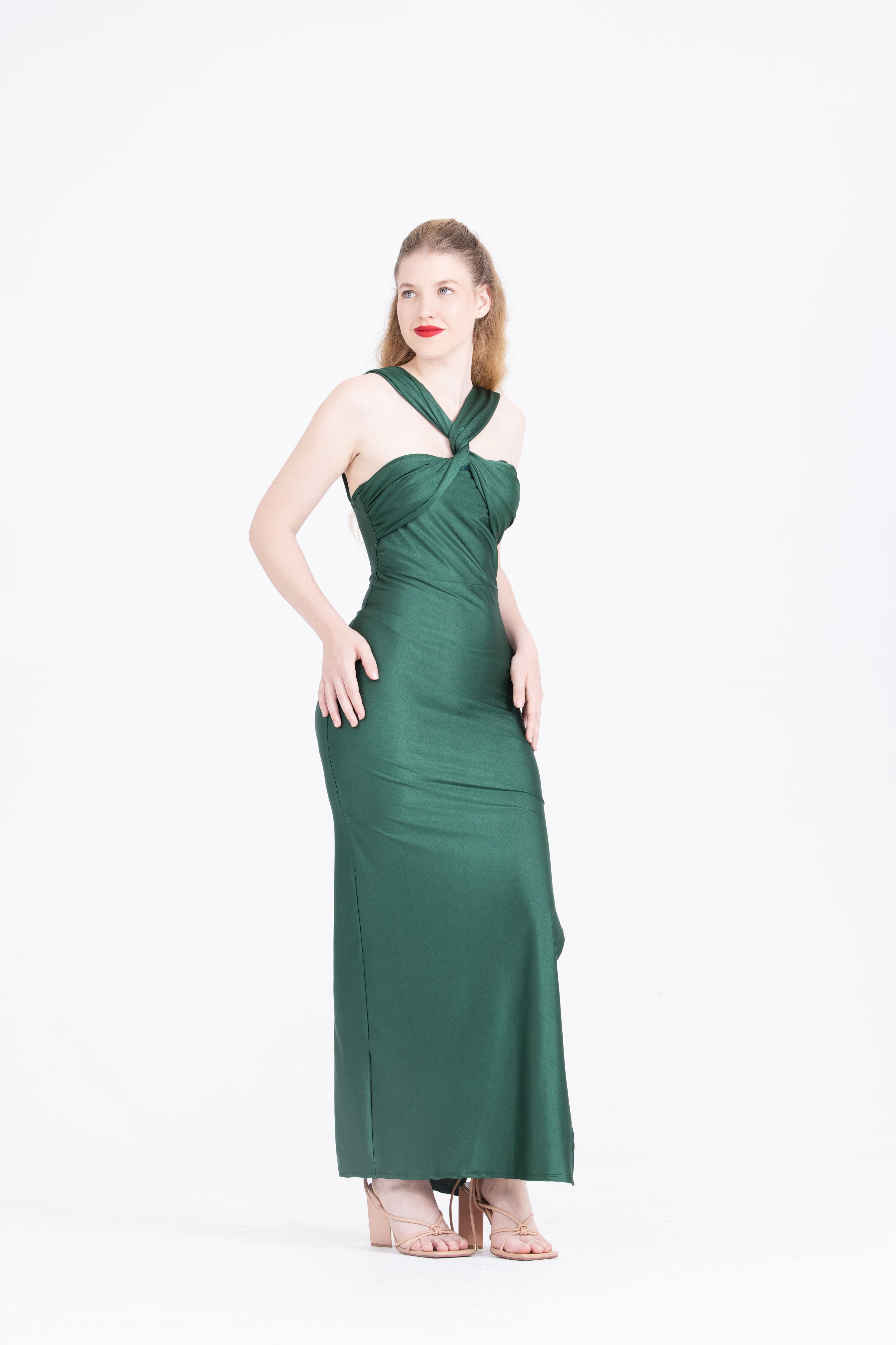 Este vestido presenta un diseño halter con un intrincado nudo en el escote que añade un detalle moderno y distintivo. Confeccionado en un tejido satinado que abraza y realza la figura femenina, este vestido largo es sinónimo de elegancia y glamour.