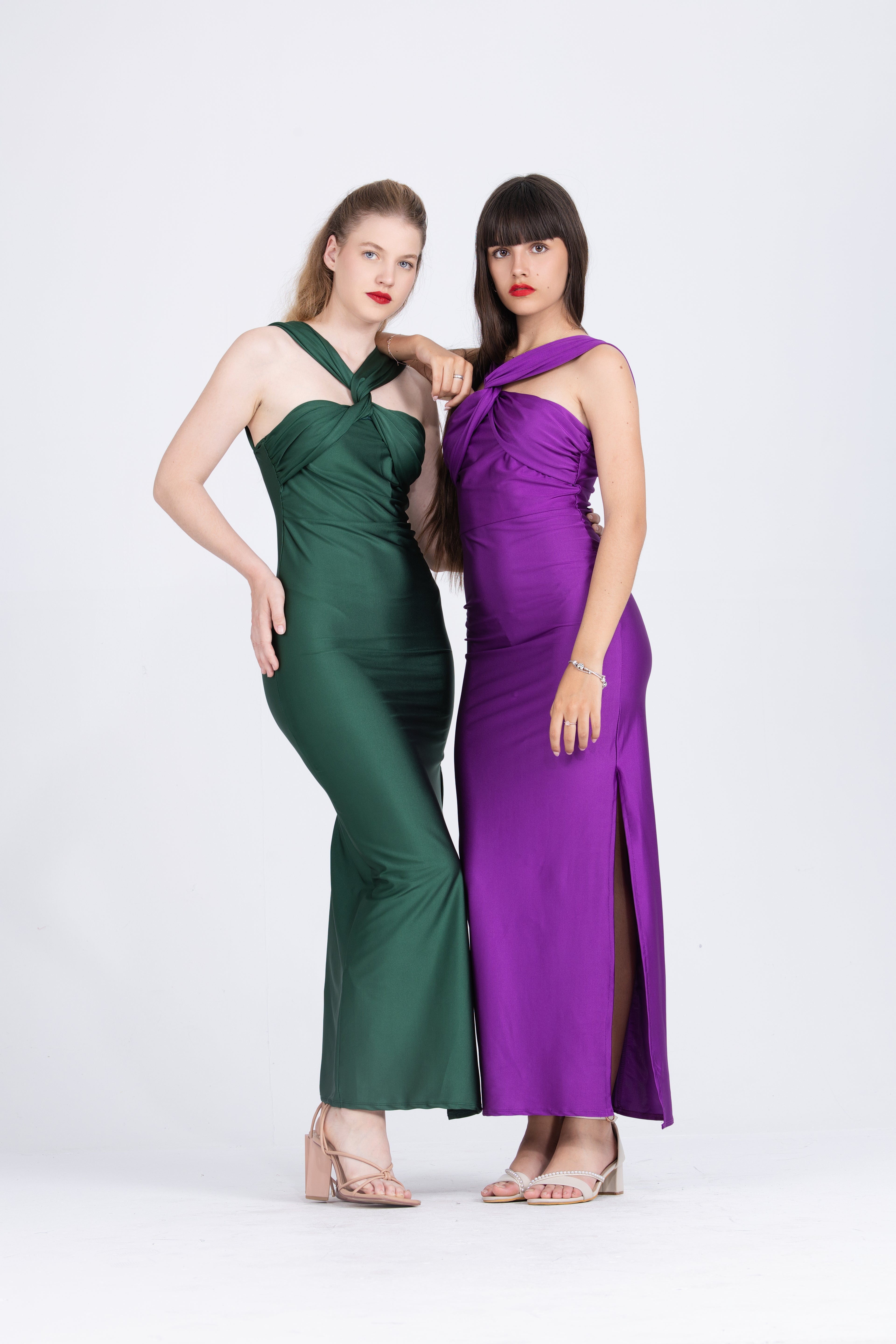 Disponible en una gama de colores sofisticados como el verde esmeralda y el morado profundo, se ajusta perfectamente al cuerpo, acentuando la silueta de manera favorecedora. Su longitud hasta el suelo y la abertura lateral añaden un toque de sensualidad y permiten un movimiento cómodo.