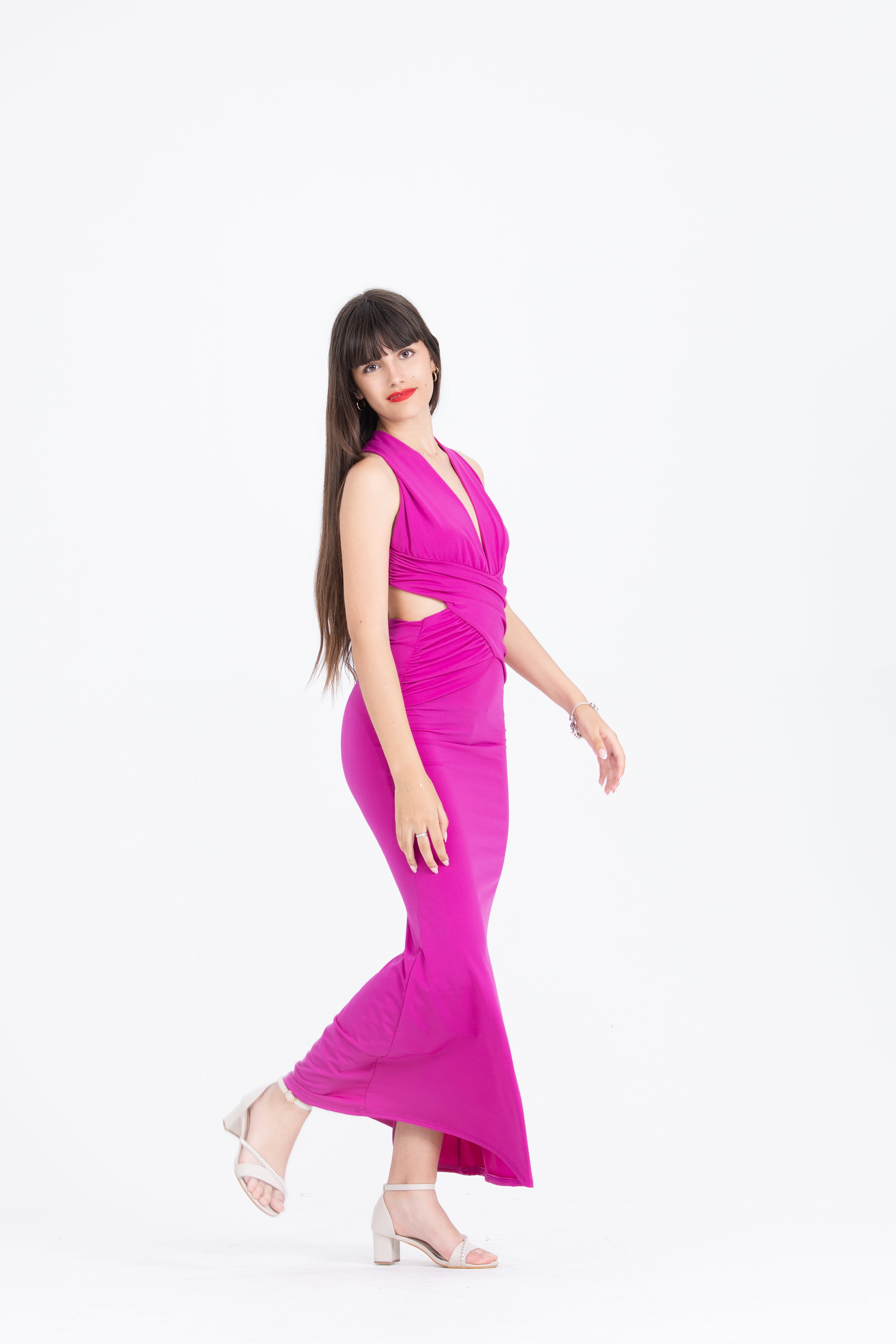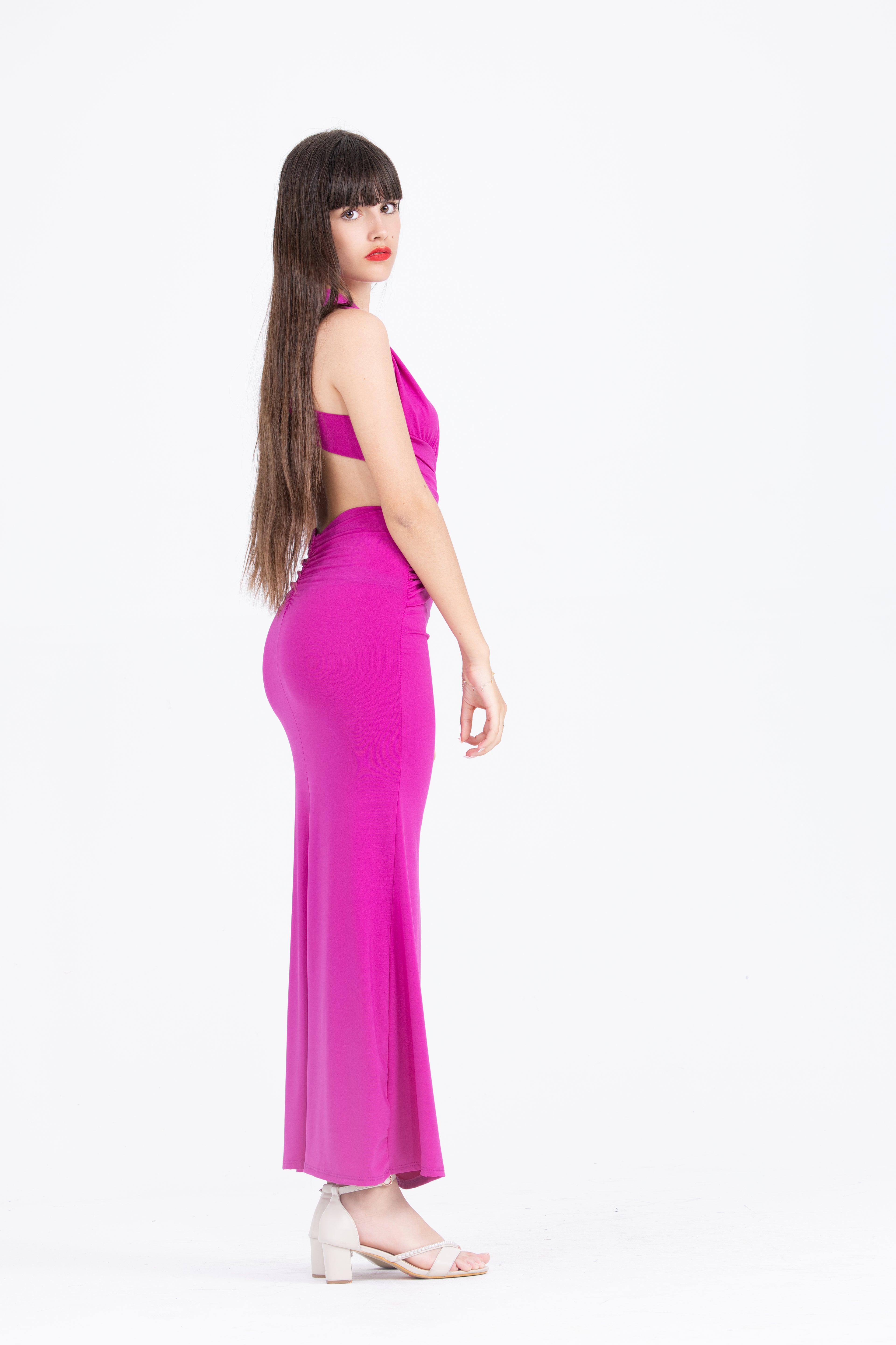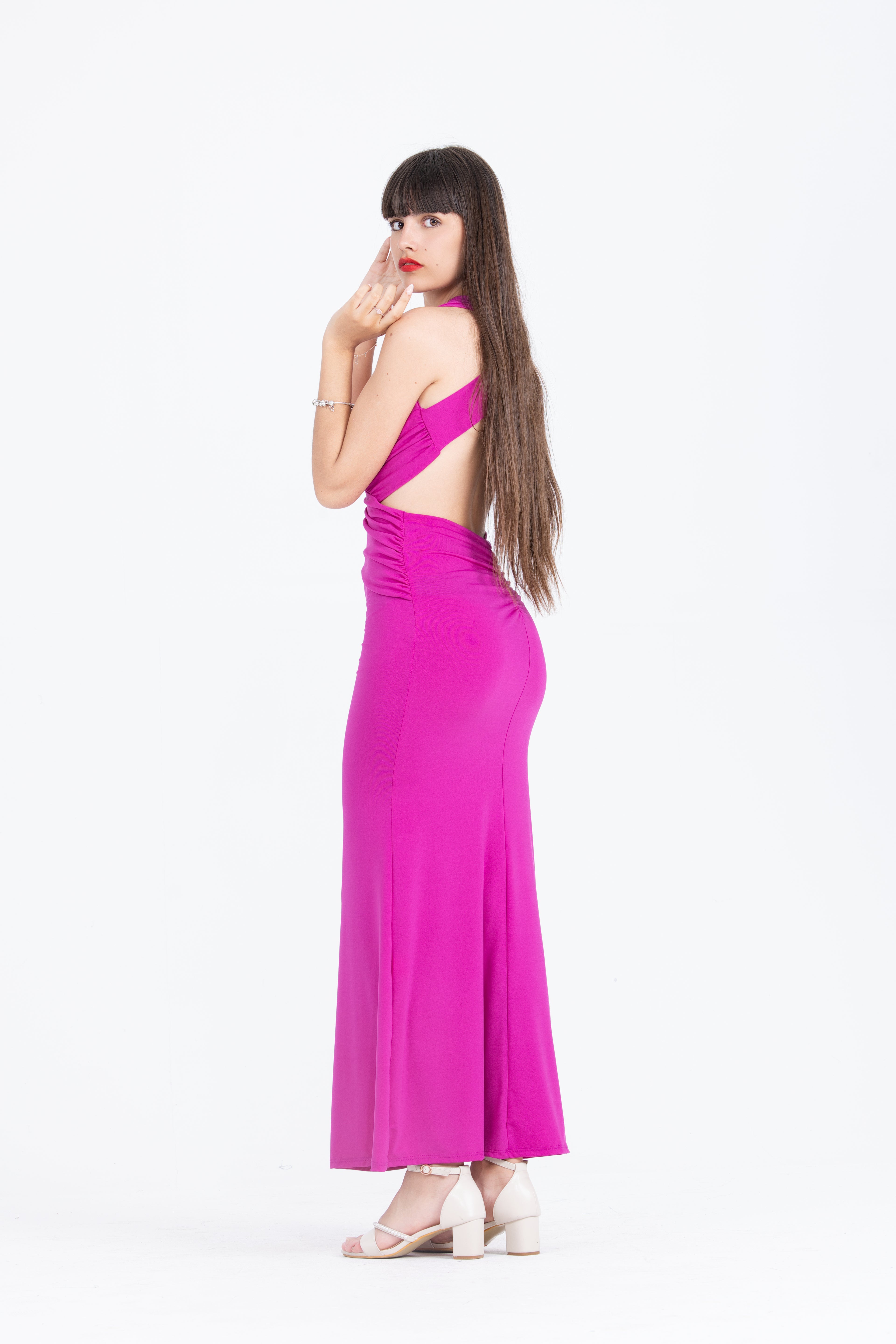 Explora la elegancia del vestido halter cut-out de satén, disponible en dos llamativos colores: buganvilla y verde pistacho. Este vestido largo y ajustado está diseñado para realzar tu figura con un escote profundo y cortes estratégicos que aportan un toque moderno y sensual. El diseño cruzado en la cintura y la espalda descubierta añaden un detalle sofisticado, ideal para eventos formales y noches especiales.