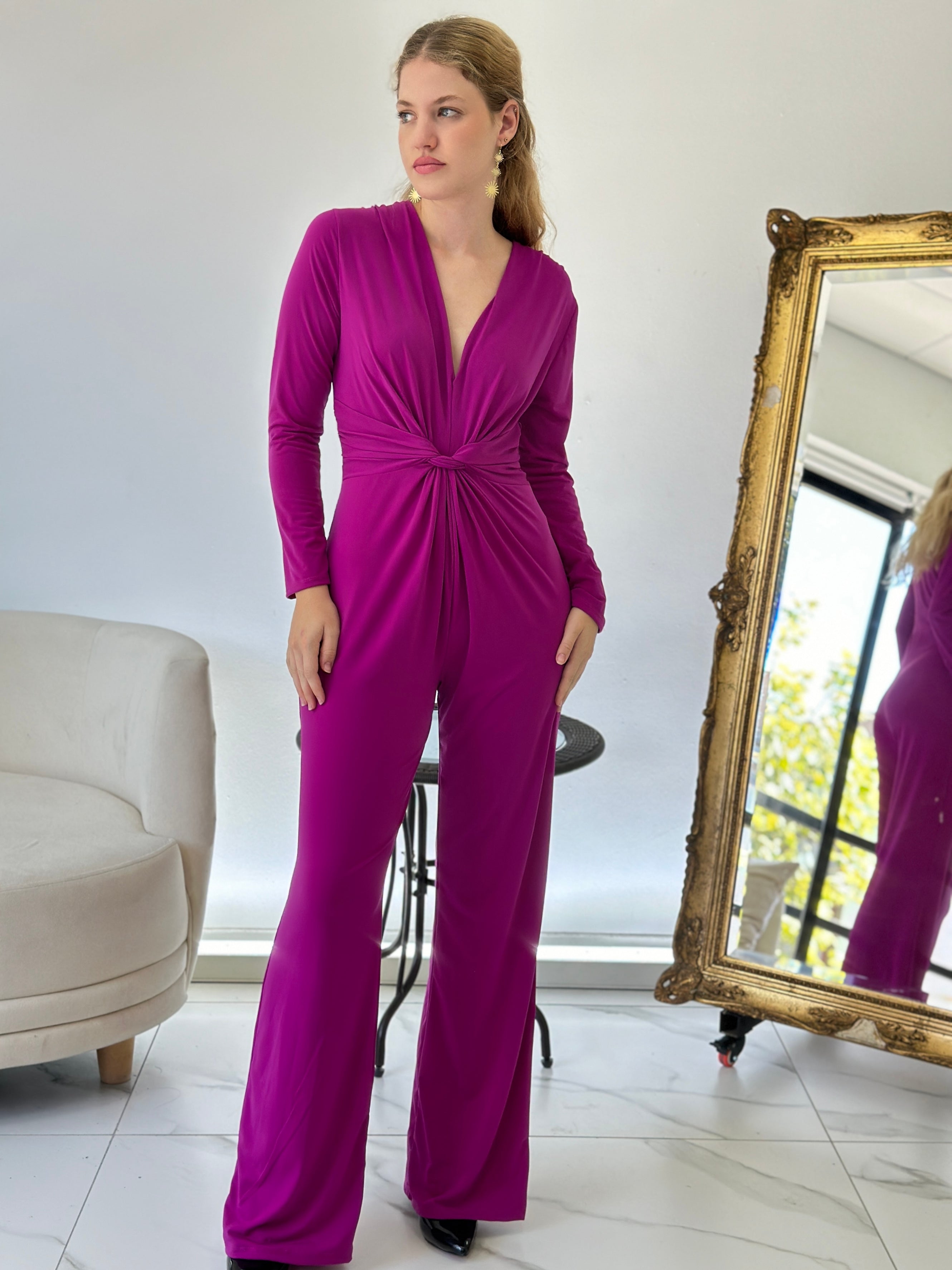 Con mangas largas y pantalones de corte recto, el Mono Kelly es una pieza versátil y sofisticada, fácil de accesorizar o llevar por sí sola. Una opción imprescindible para la mujer moderna que busca elegancia sin esfuerzo.