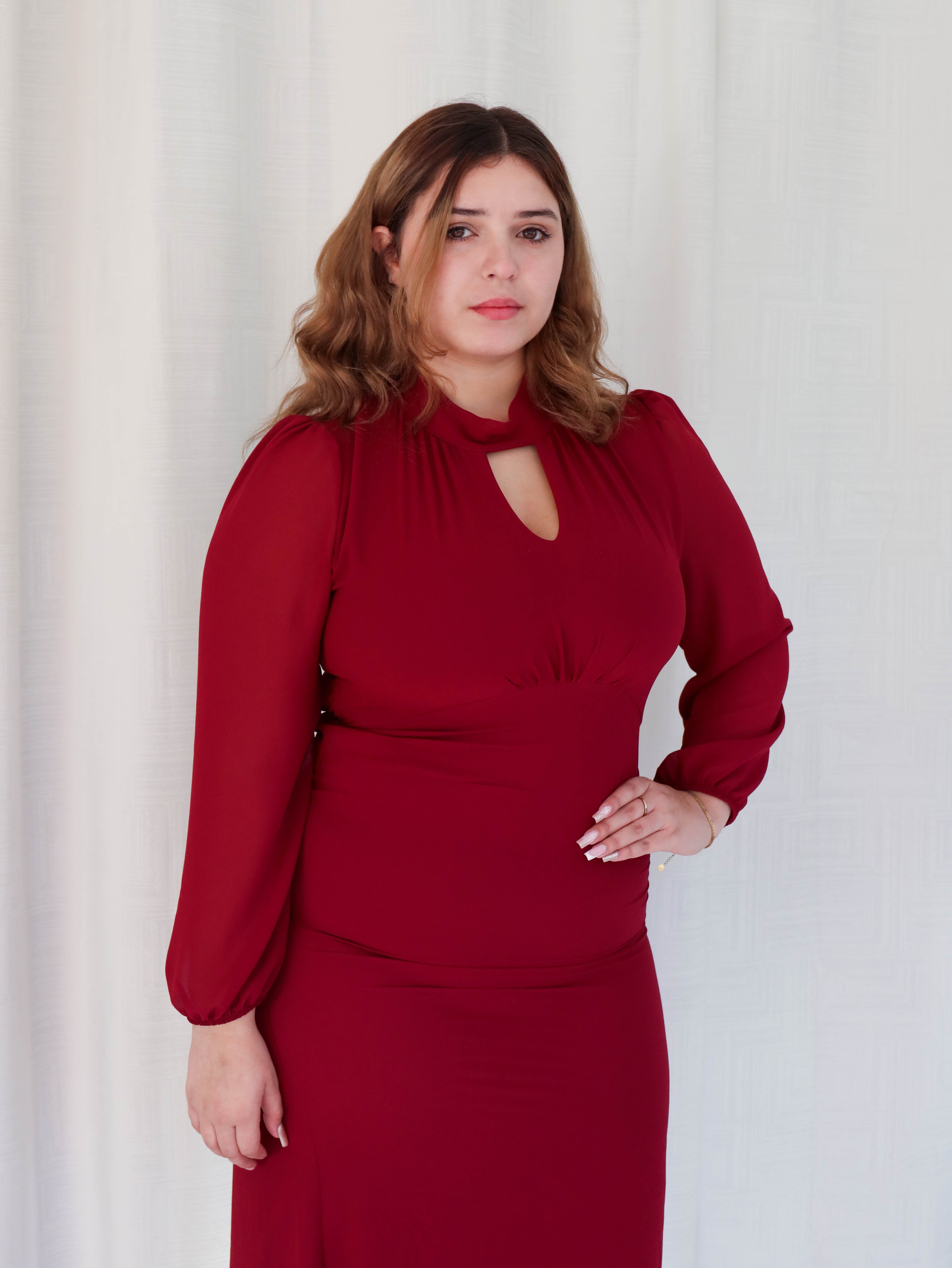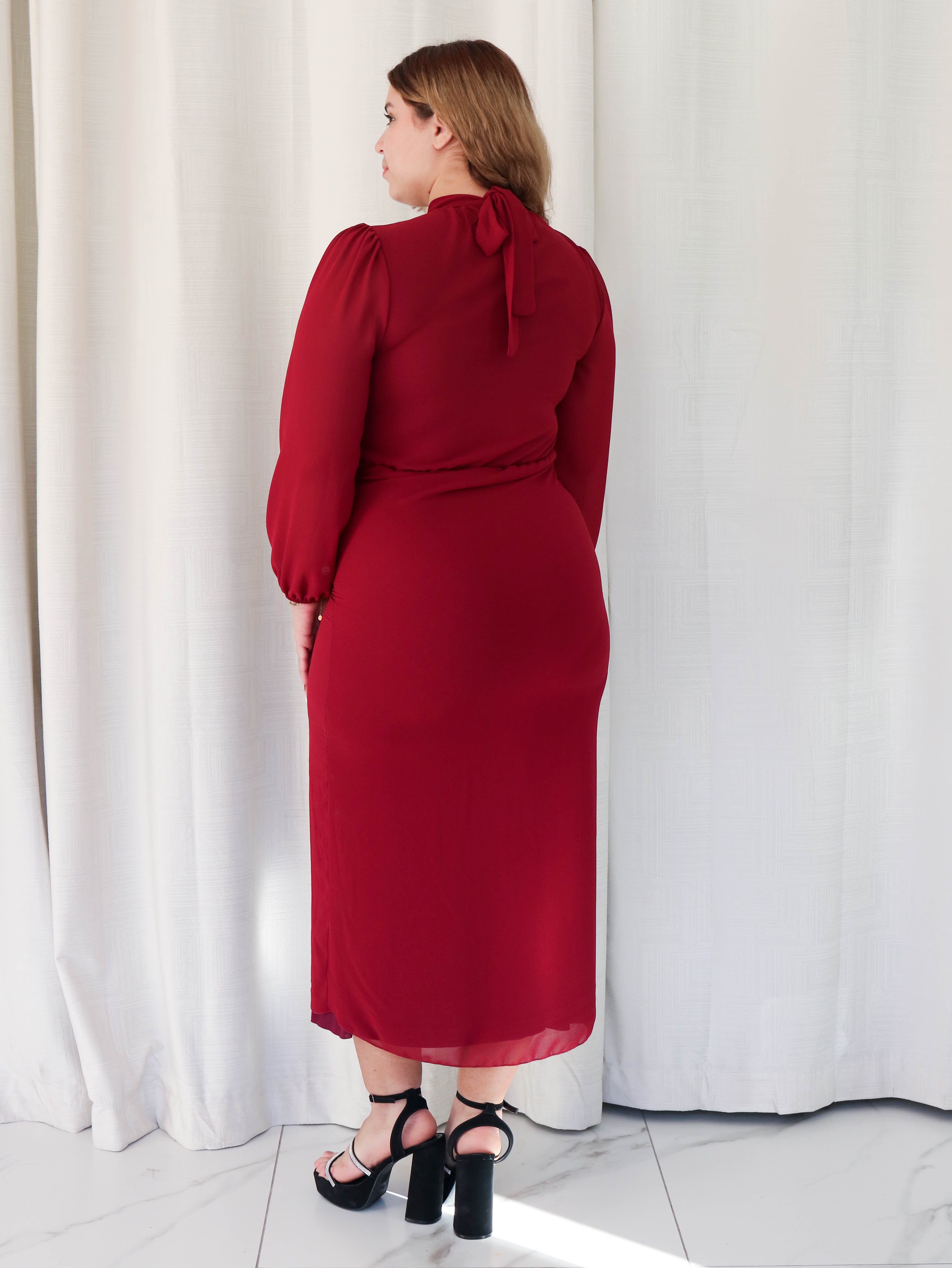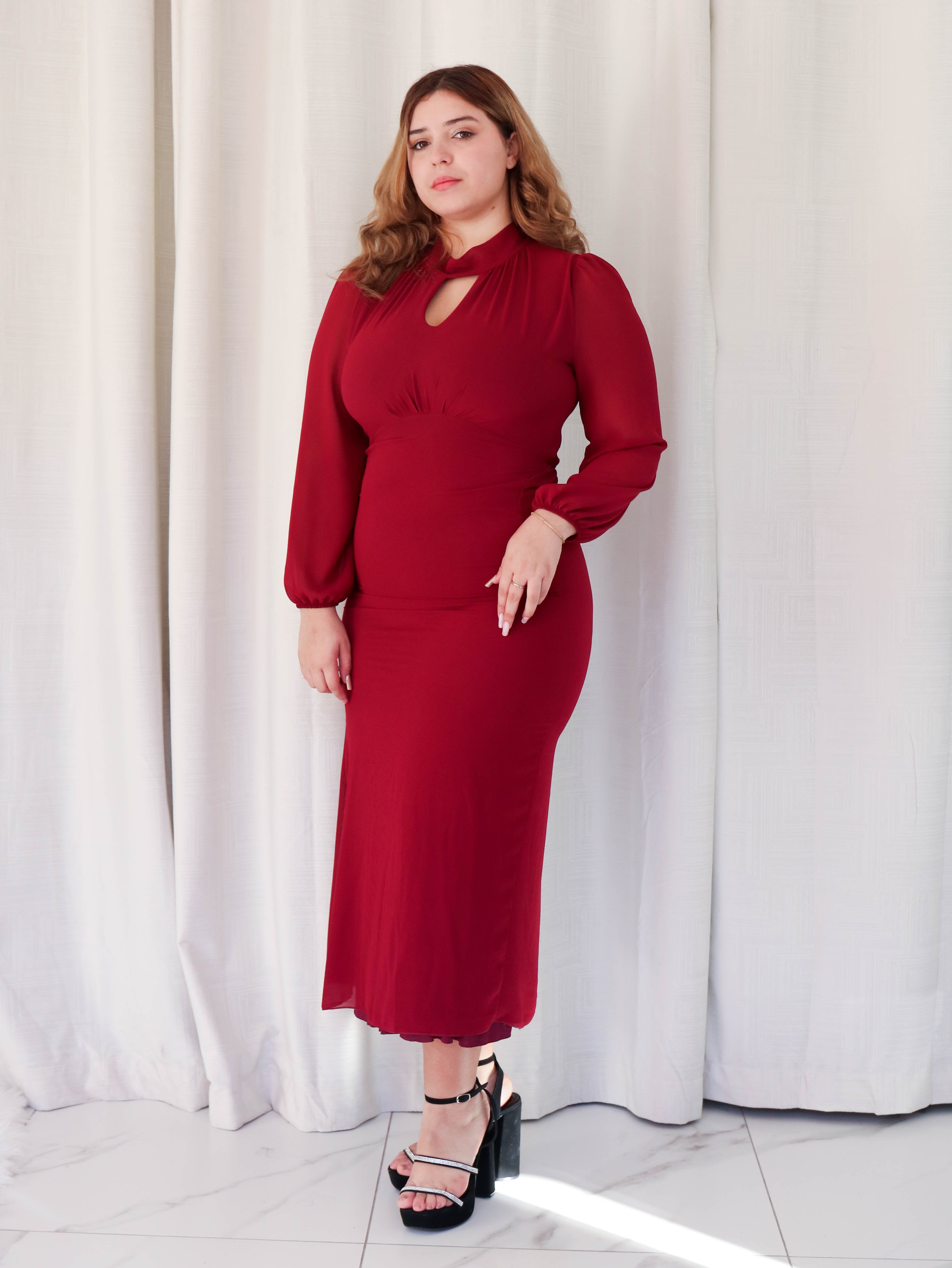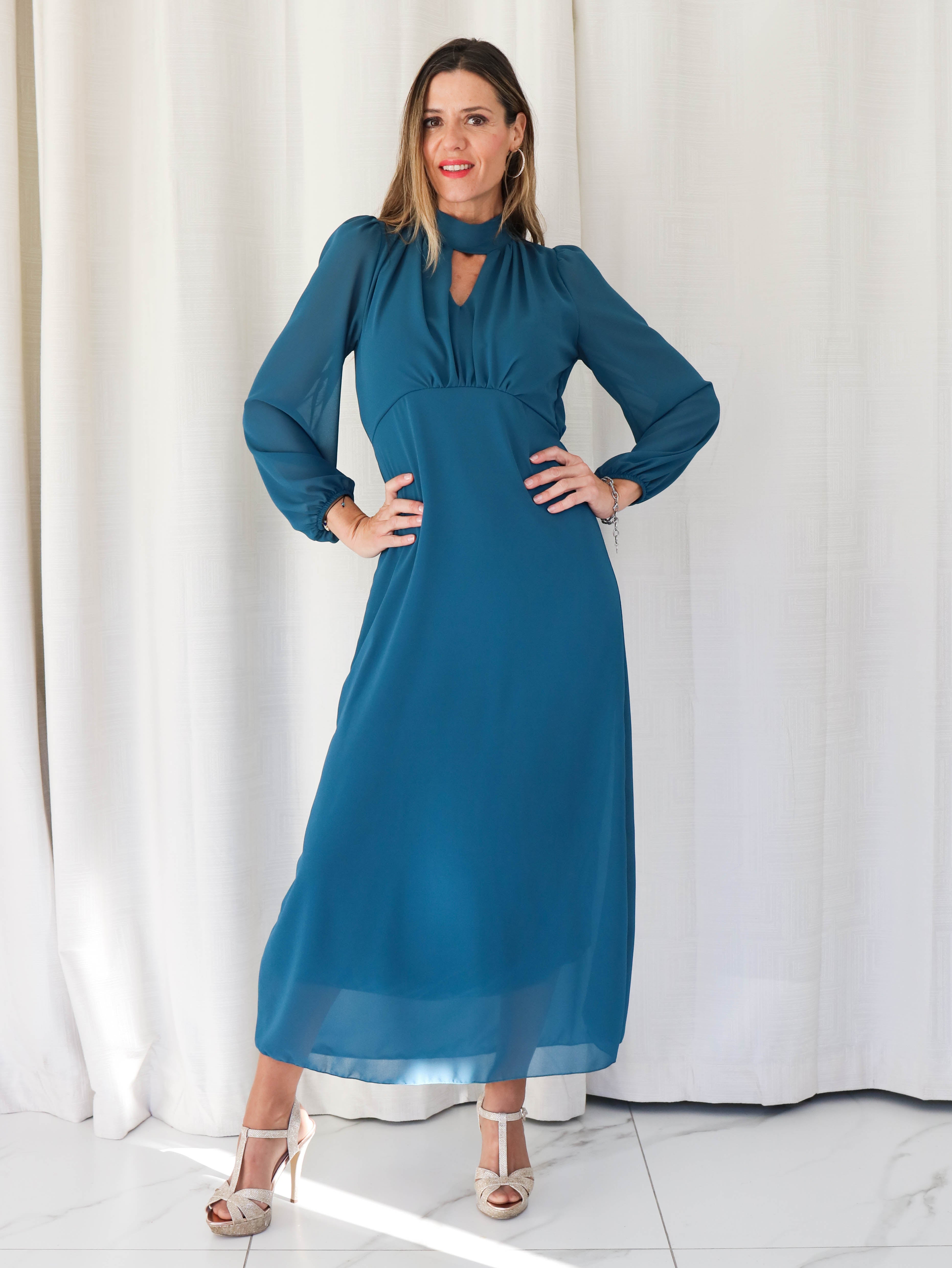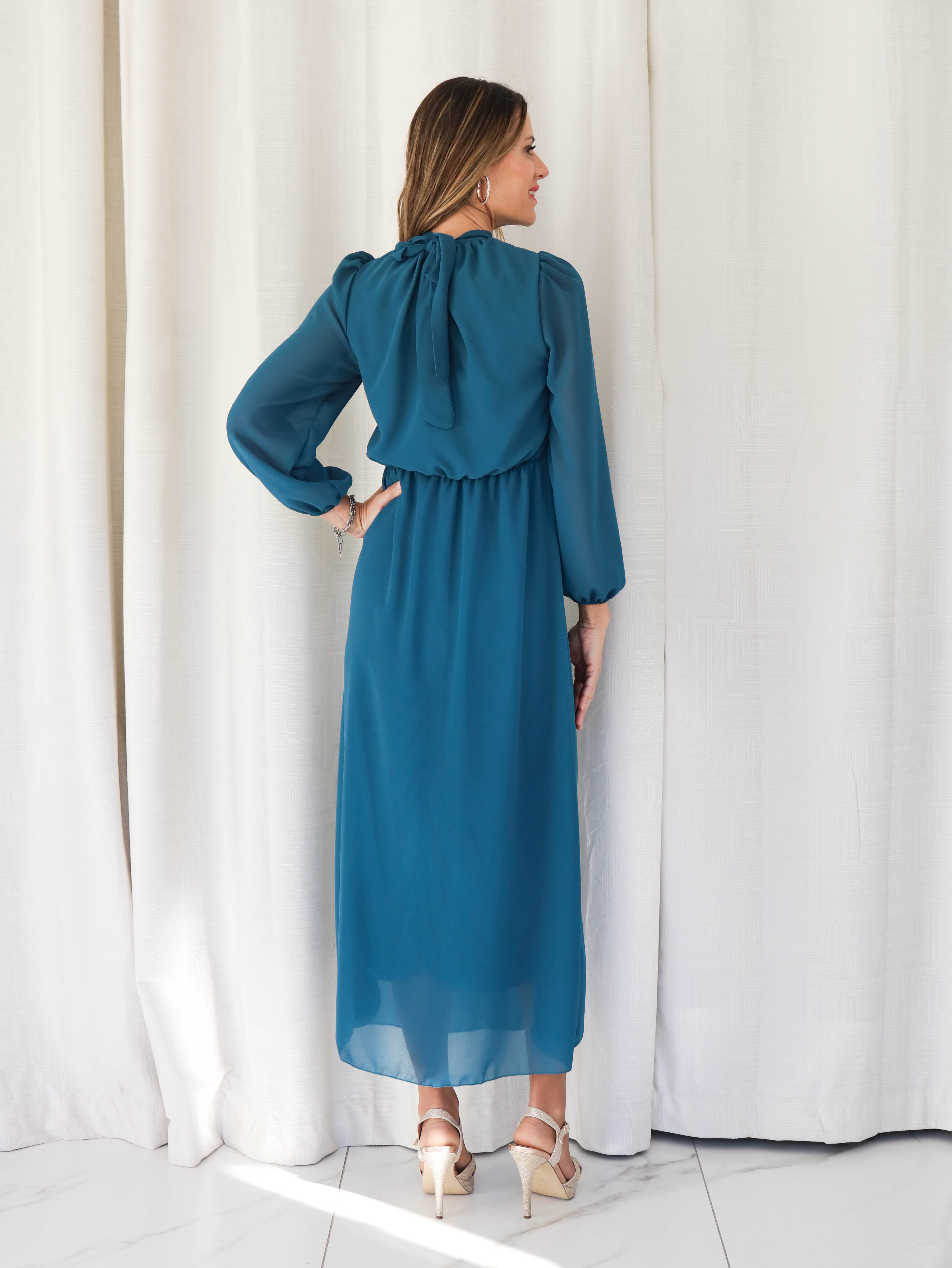 El Vestido Adeline de Gasa de Glamoryy es ideal para ocasiones formales. Su diseño midi con cuello alto y abertura en el pecho añade sensualidad, mientras que el lazo en la parte posterior garantiza un ajuste perfecto.