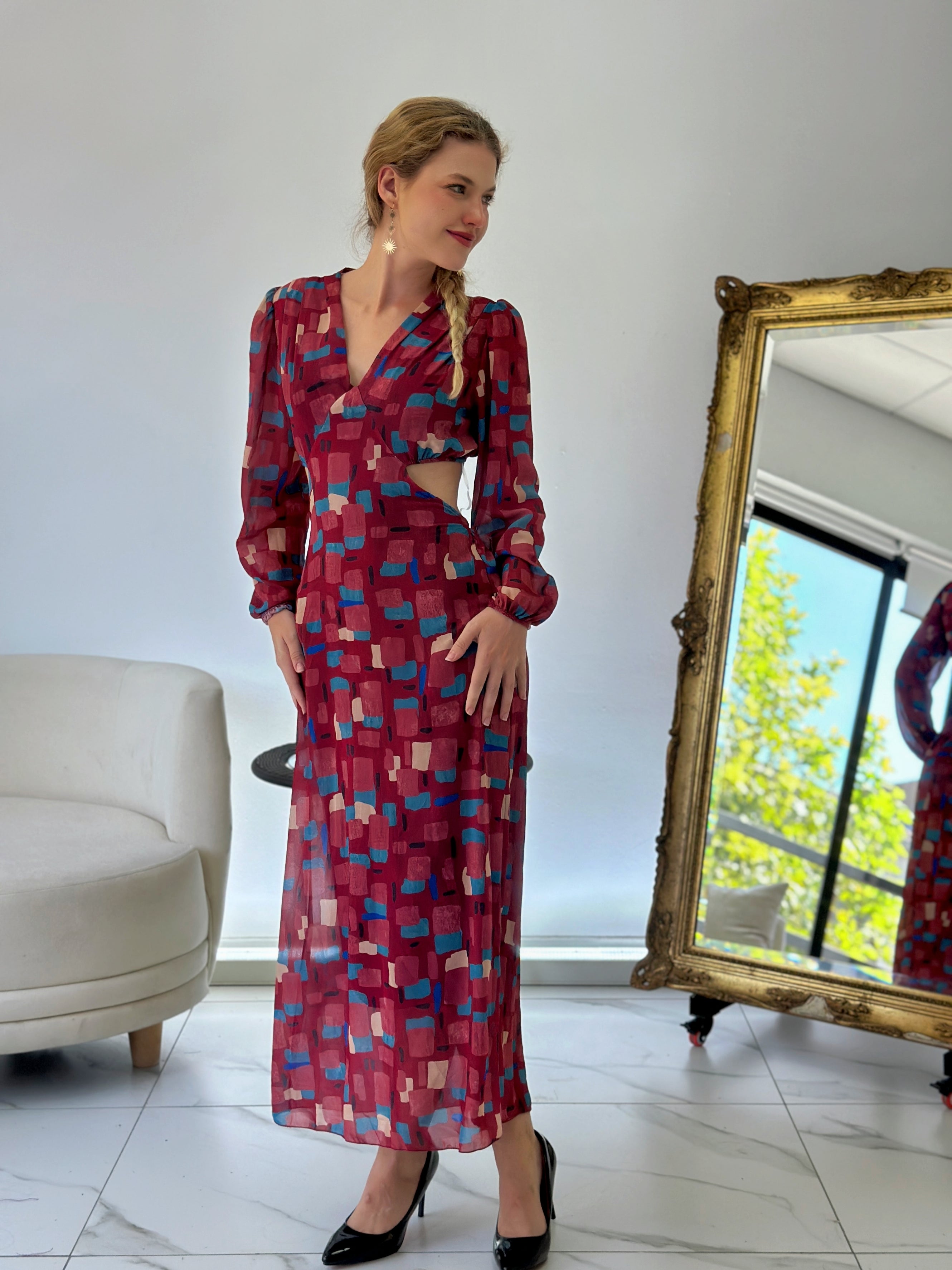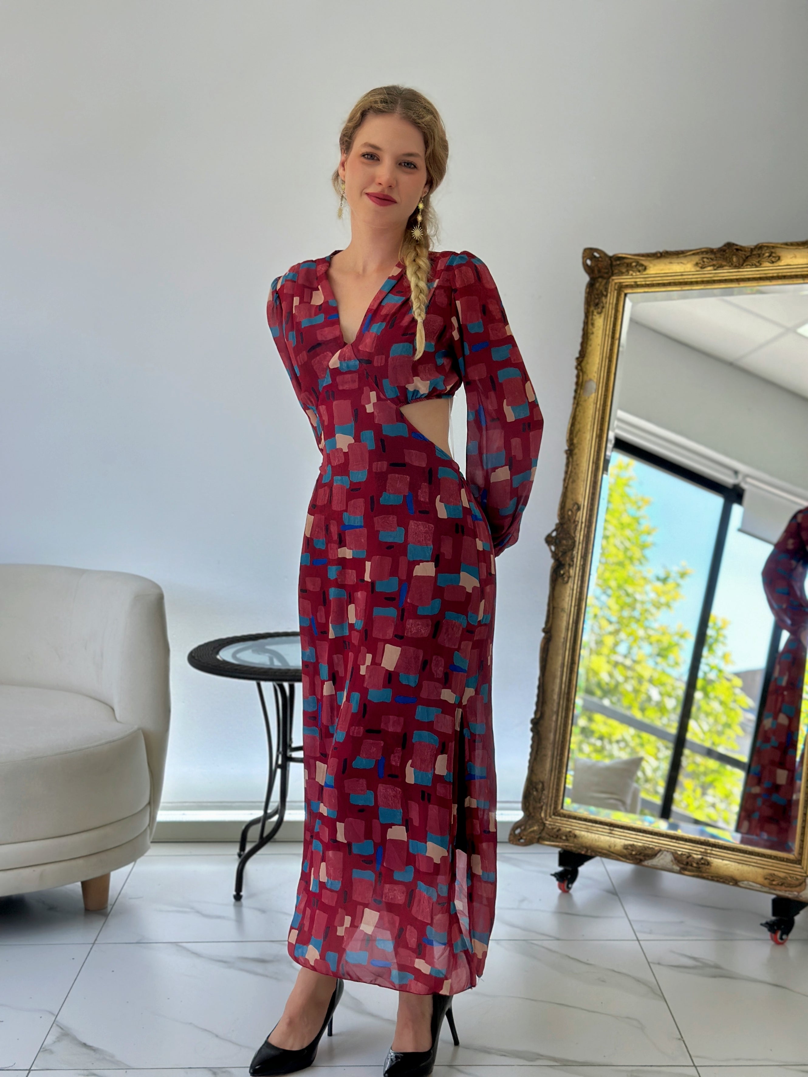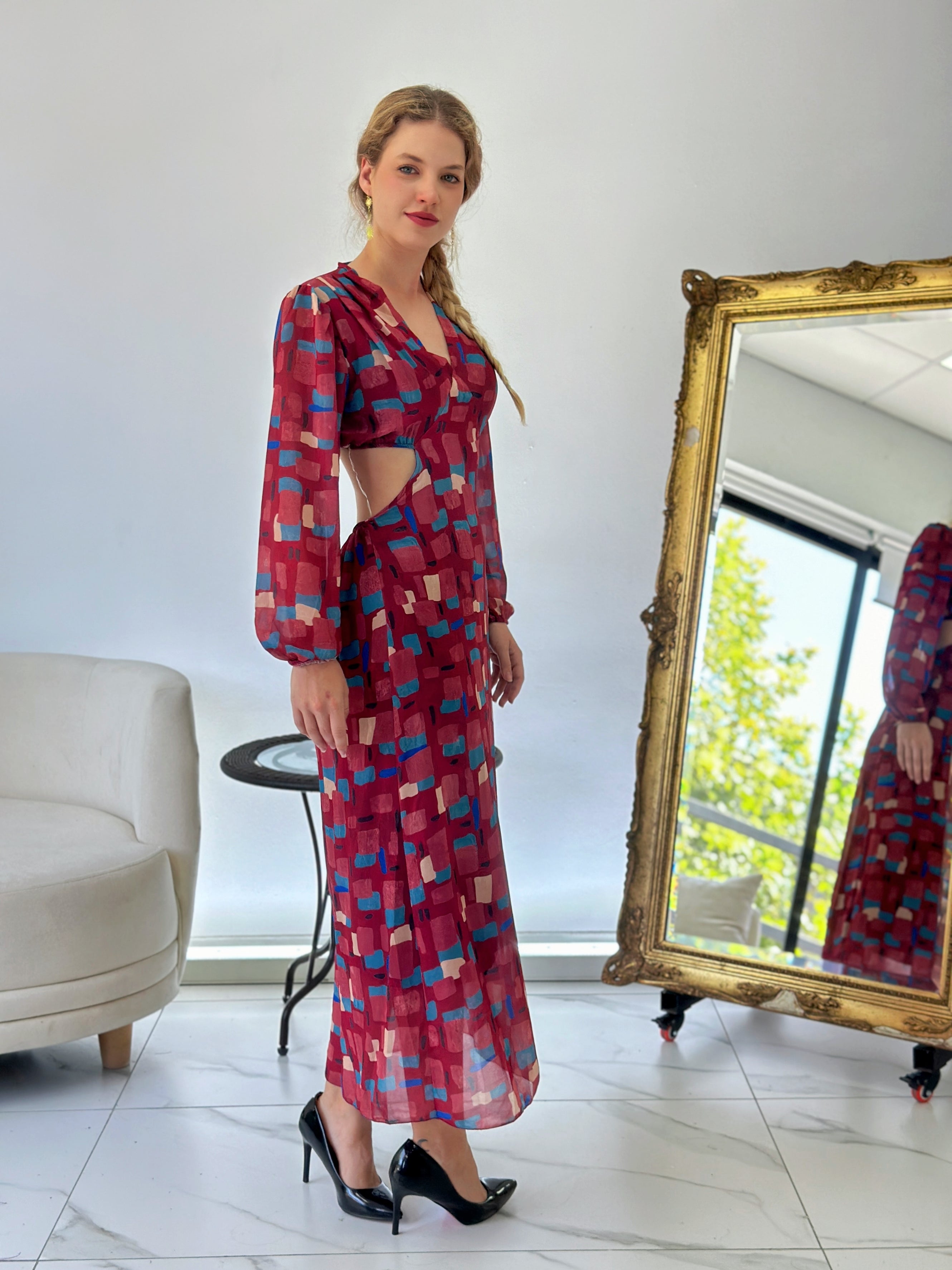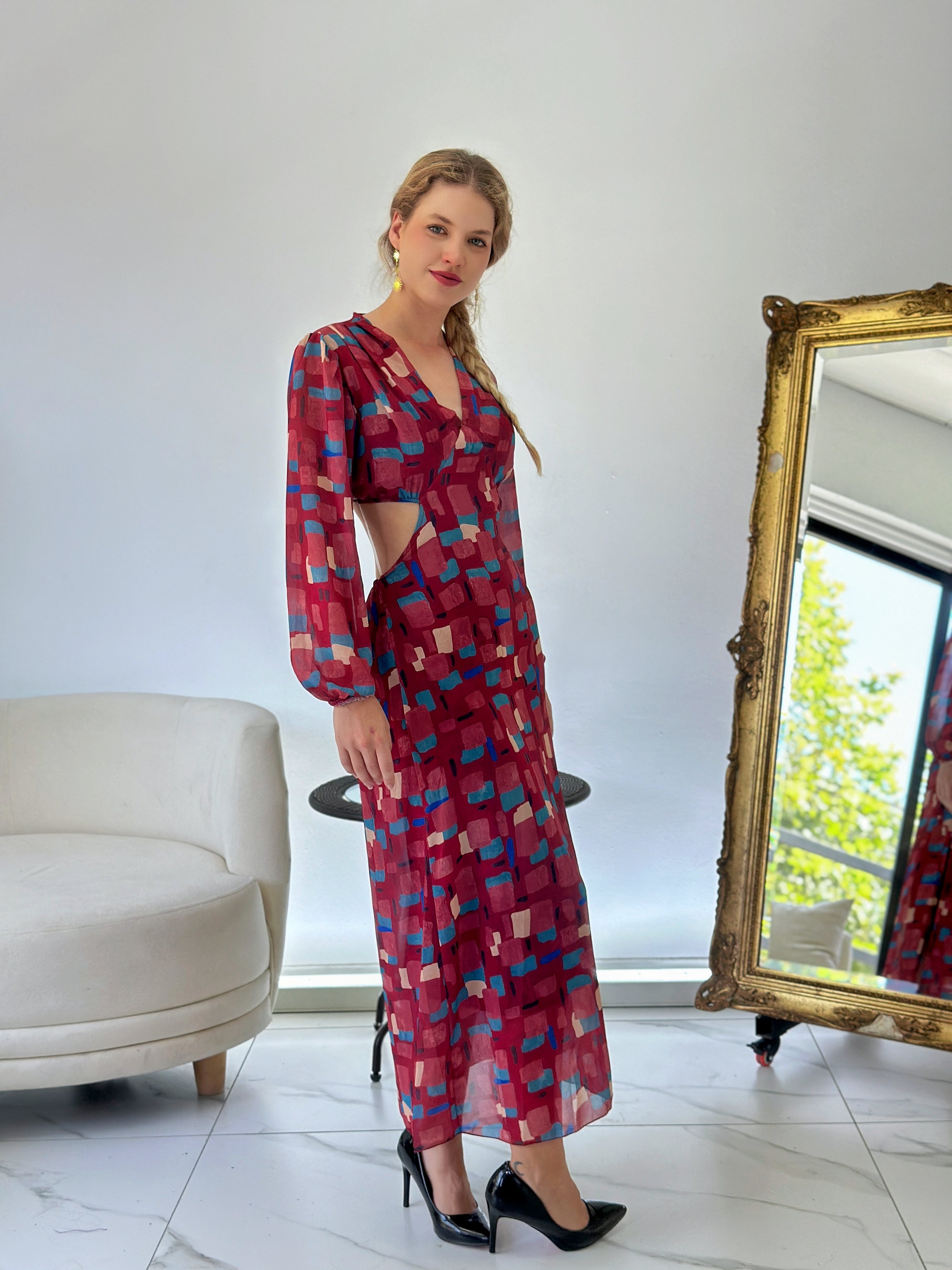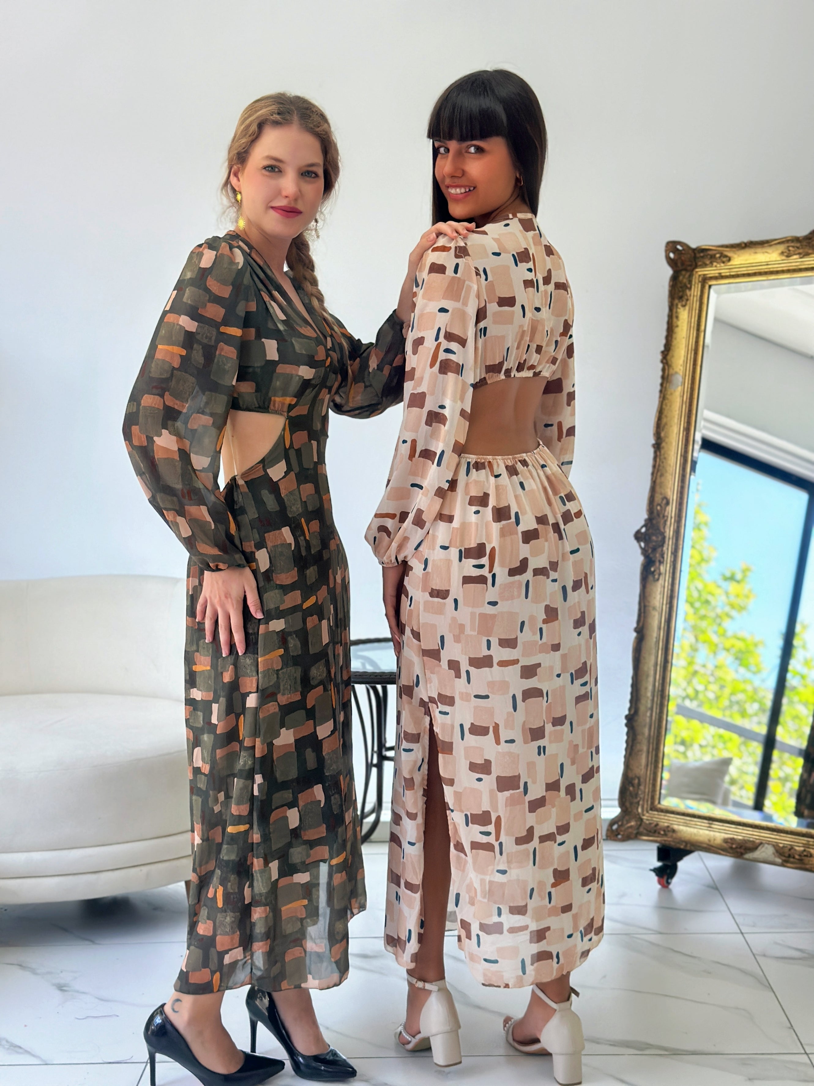 El estampado geométrico en tonos cálidos y fríos le añade un toque moderno y artístico, haciendo de este vestido una opción ideal tanto para eventos formales como casuales. Disponible en tres colores: vino con detalles en azul y rosa, crema con matices neutros y verde oliva con acentos terracota, este vestido se adapta a cualquier estilo personal.
