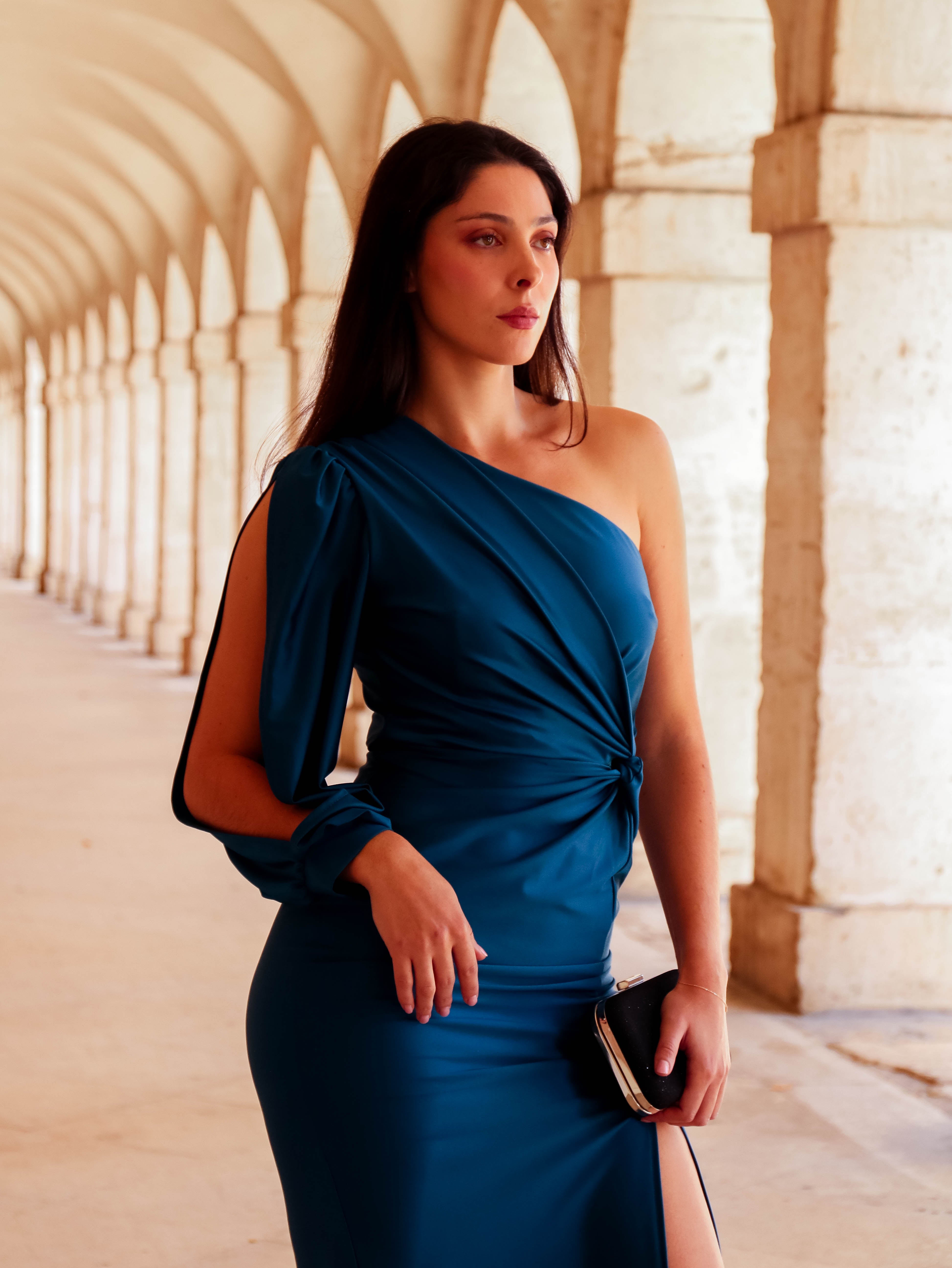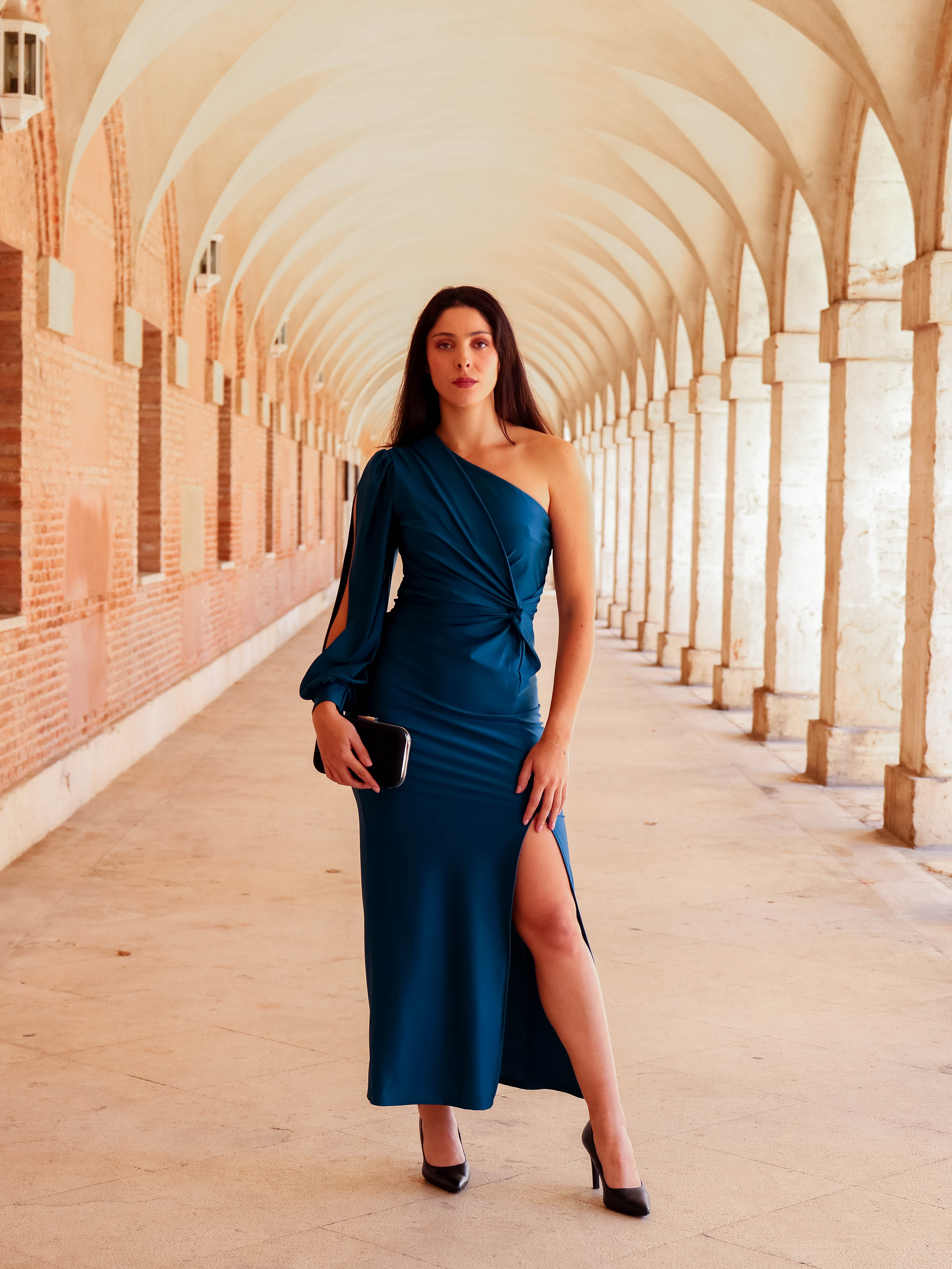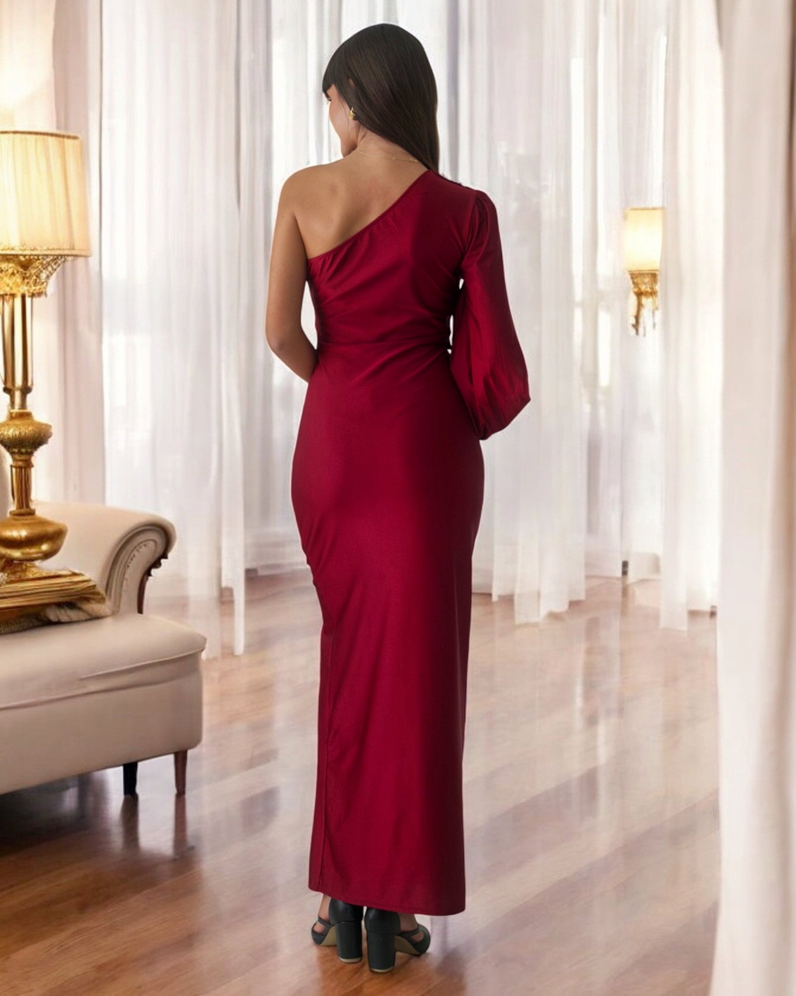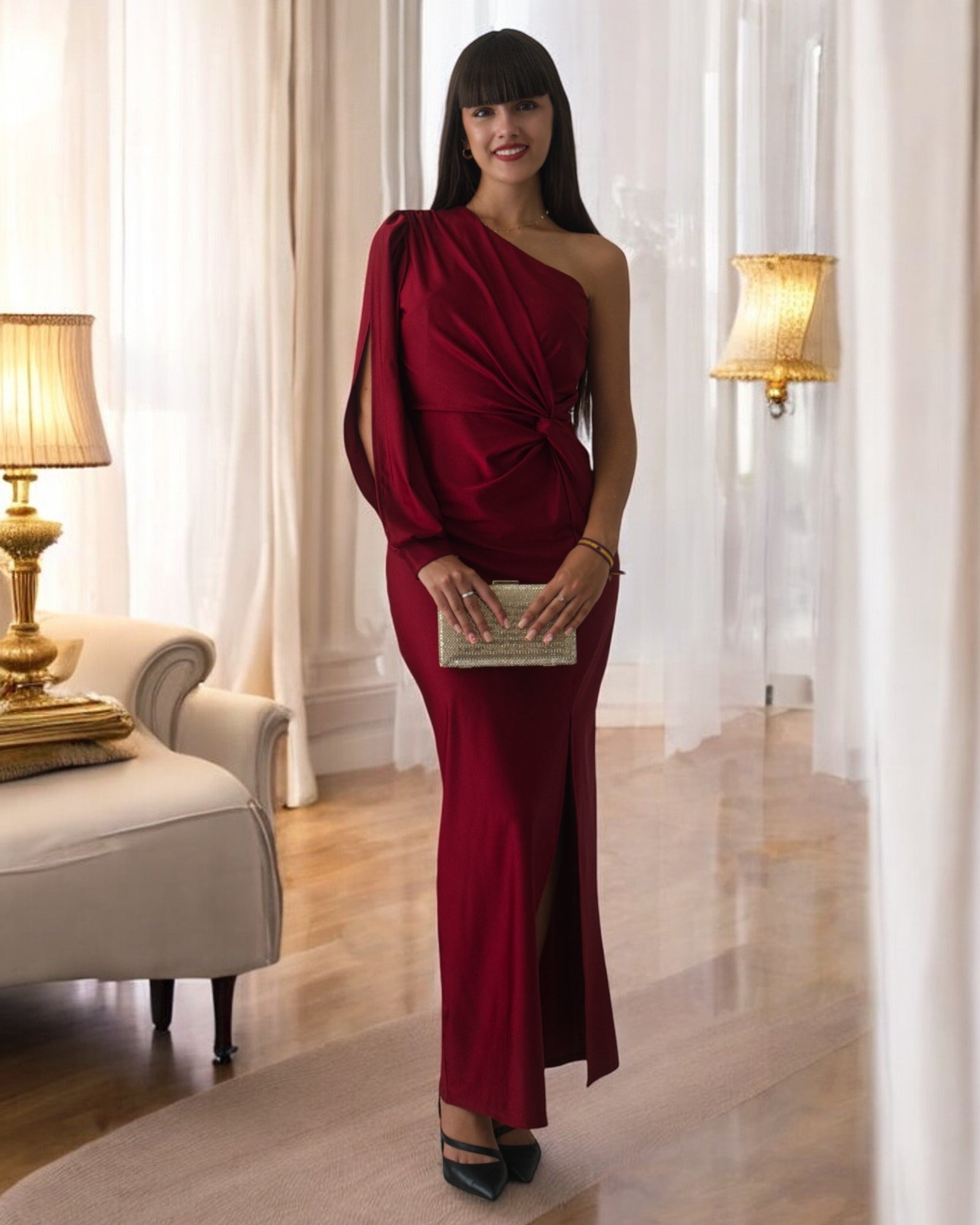 El Vestido Largo con hombro descubierto de Glamoryy es la opción perfecta para eventos de gala, bodas y celebraciones nocturnas. Su diseño elegante presenta un escote asimétrico y una manga larga que aporta un toque moderno y dramático. Confeccionado en suave satén, este vestido ajustado realza la figura y define la cintura con un fruncido lateral, creando una silueta dinámica y sofisticada.