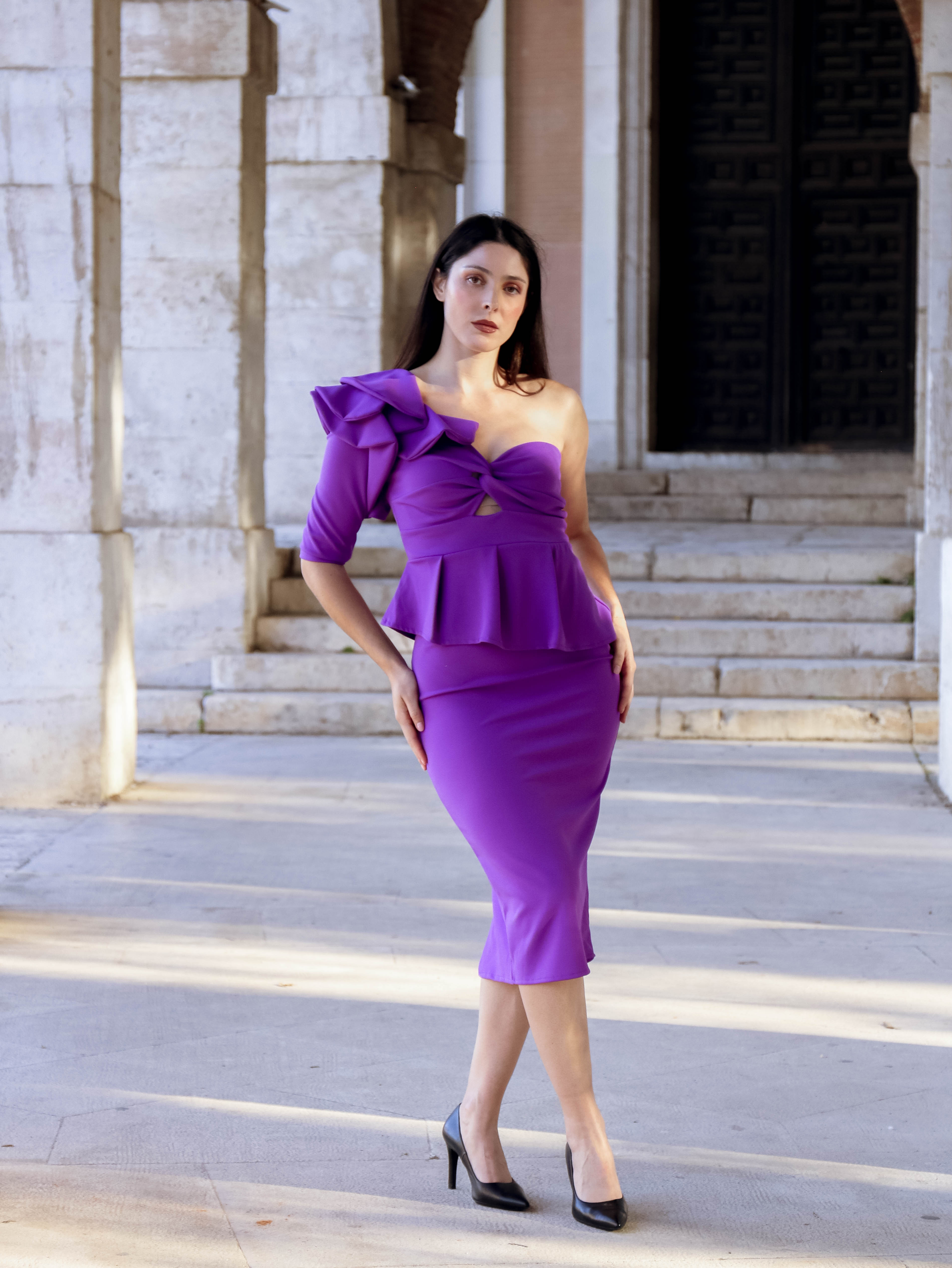 Este vestido con nudo y hombro descubierto de Glamoryy destaca en eventos nocturnos y de gala. Su diseño asimétrico con manga larga en un solo lado y nudo frontal aporta elegancia y originalidad.