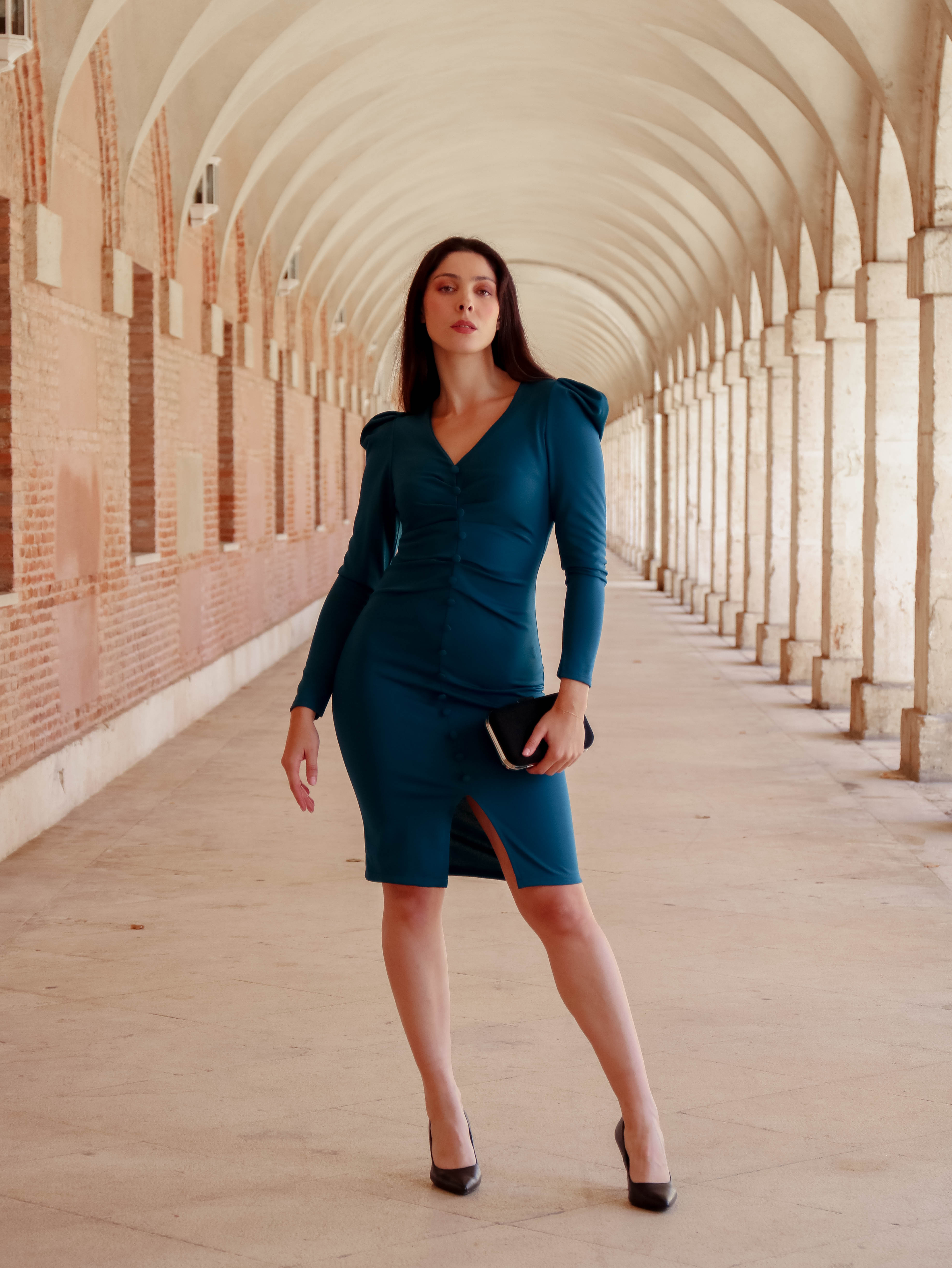 El Vestido Silueta de Sofia de Glamoryy es una declaración de estilo audaz y femenino. Con mangas abullonadas y botones decorativos, este diseño celebra la figura femenina con elegancia.