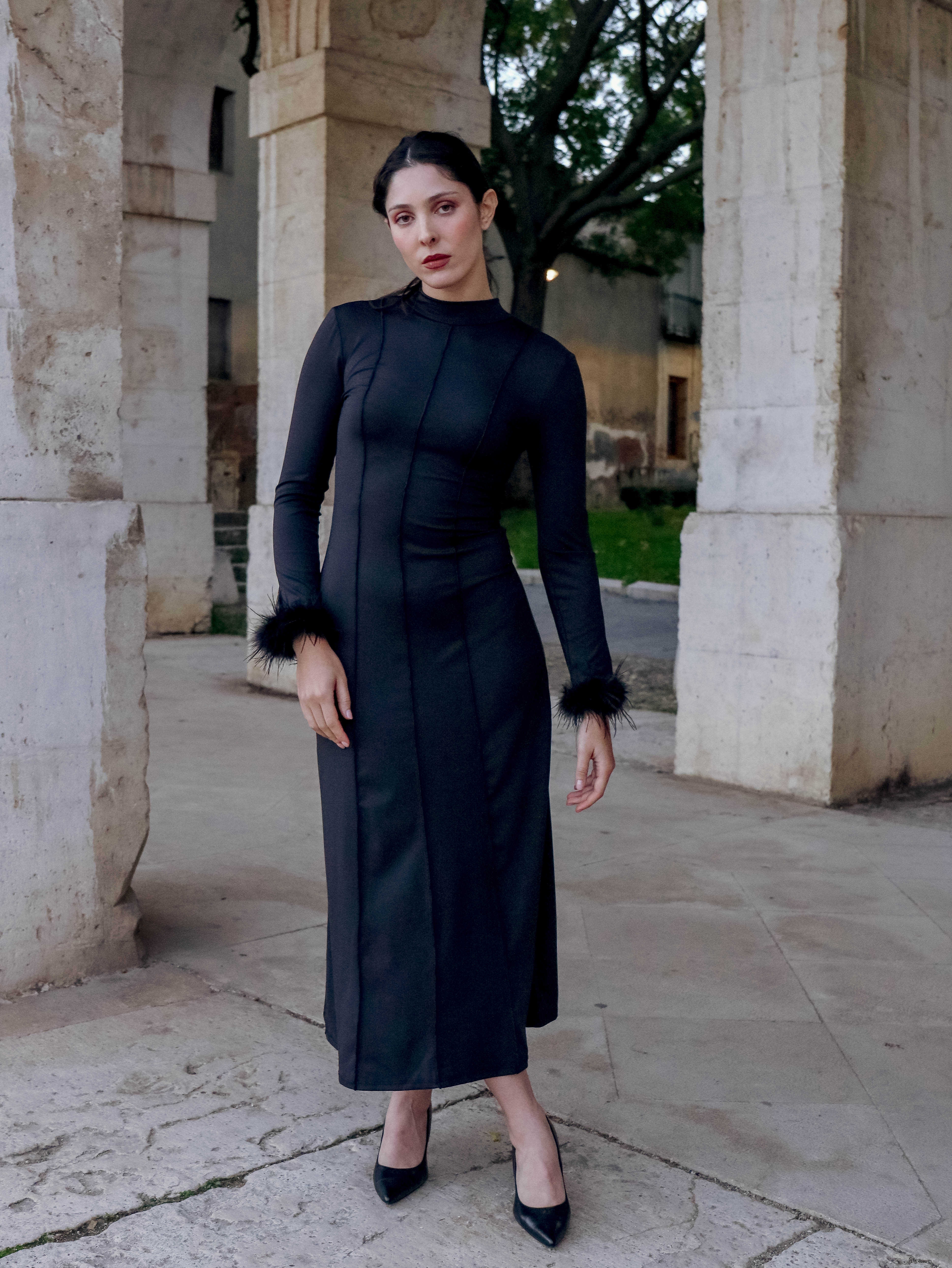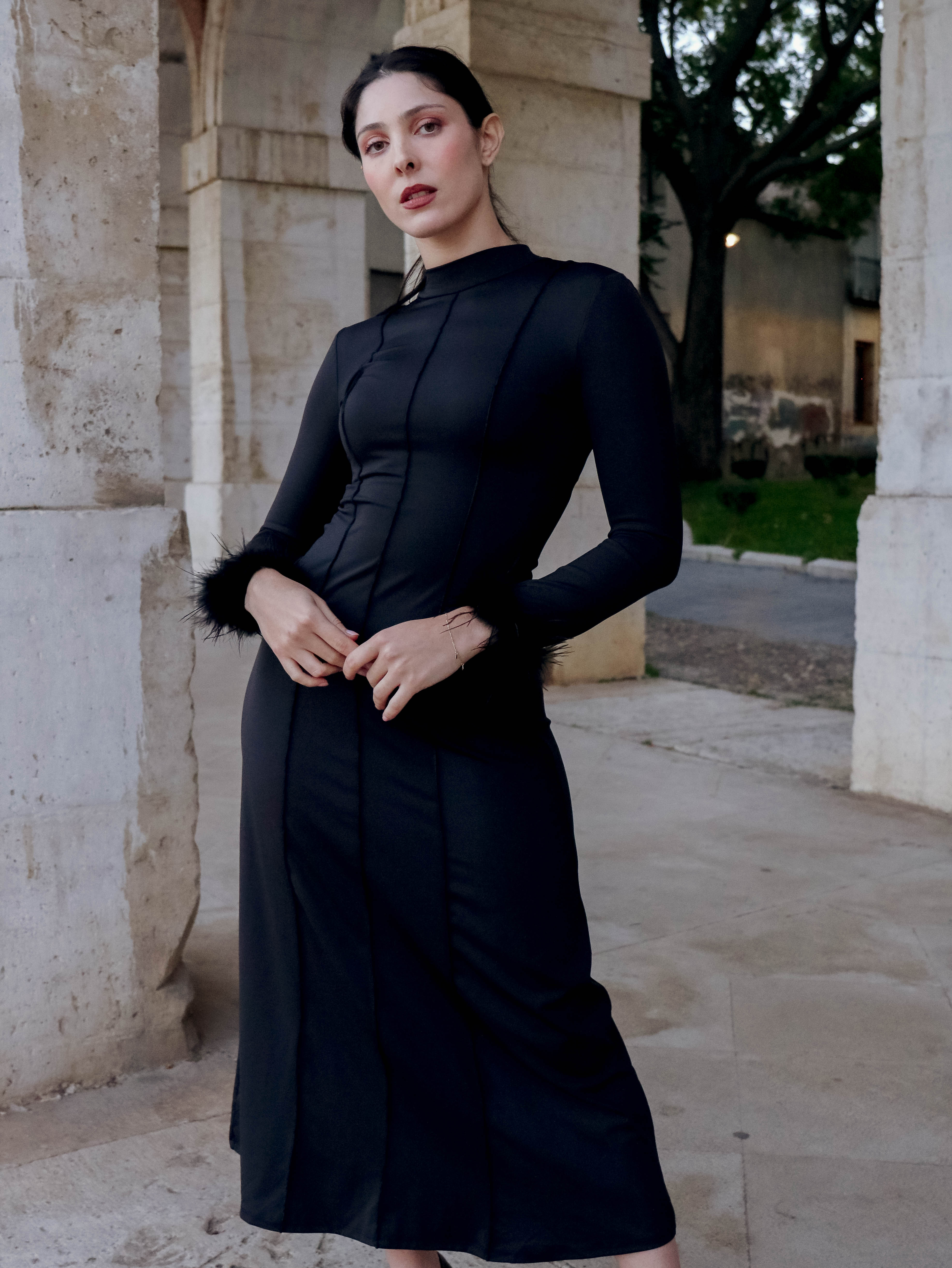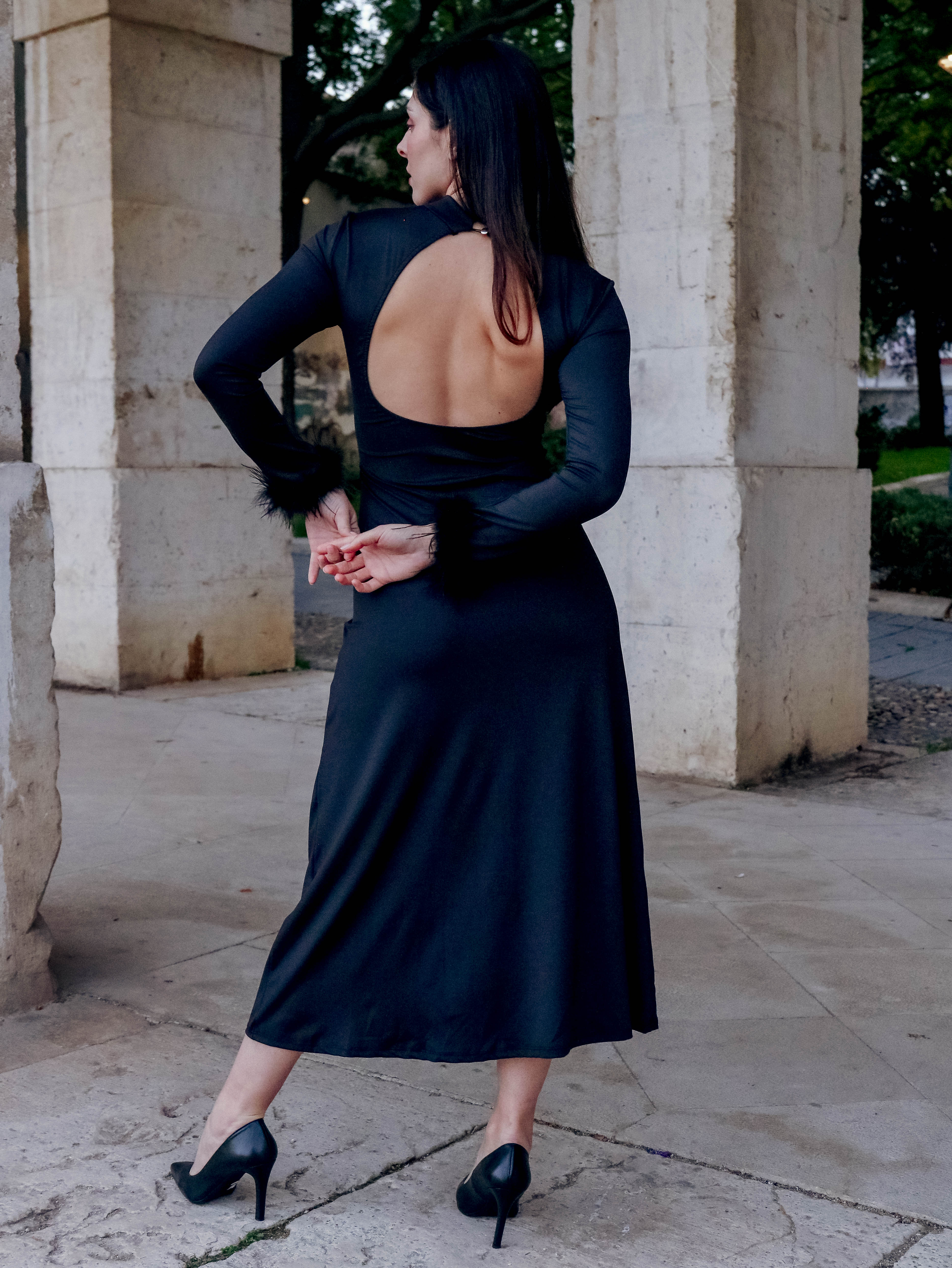El Vestido Bela Negro de Glamoryy cuenta con un diseño sofisticado y una espalda descubierta que le da un toque sensual y moderno. Las plumas delicadas en las mangas aportan un aire de glamour, mientras que la falda ancha proporciona comodidad y movimiento, permitiéndote lucir impecable en cualquier ocasión.