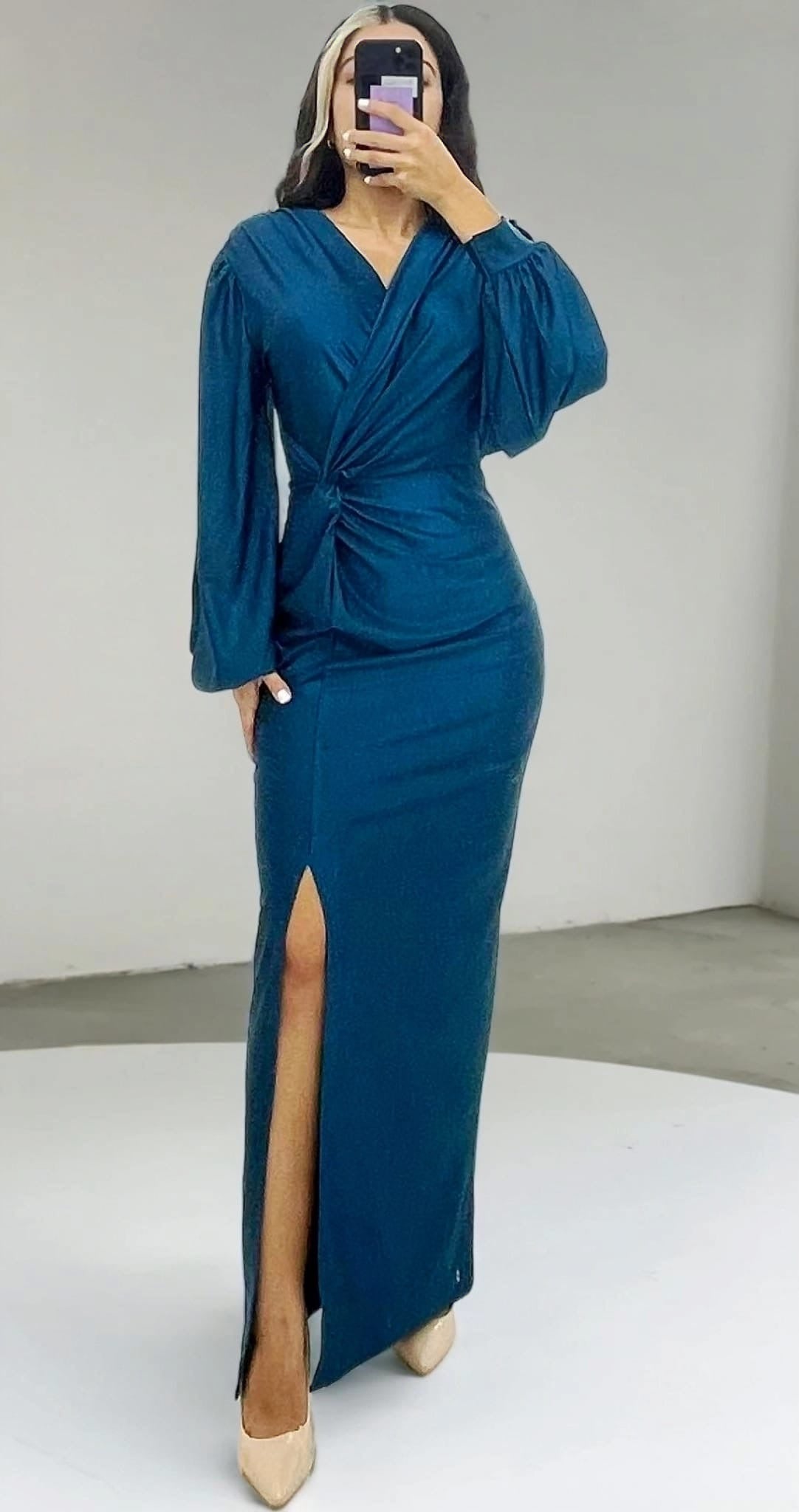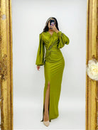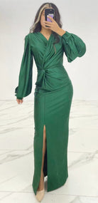 Este vestido tiene un diseño elegante y sofisticado, cruzado en el pecho y una abertura en las mangas. Hecho de un suave y satinado material, es perfecto para cualquier ocasión especial, ya sea como invitada a una boda o para una comunión o graduación. Su estilo original y favorecedor te hará sentir exclusiva y glamurosa.