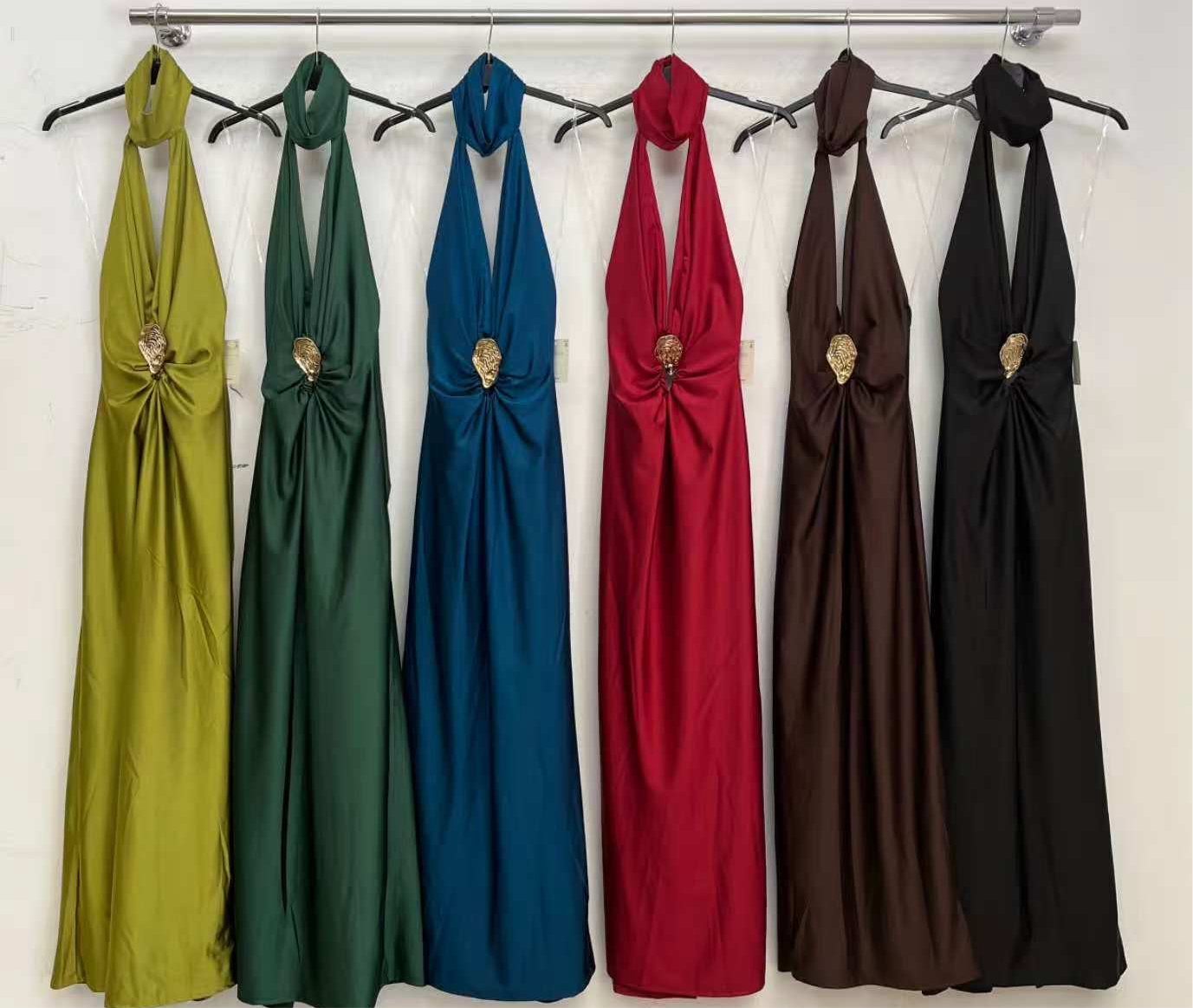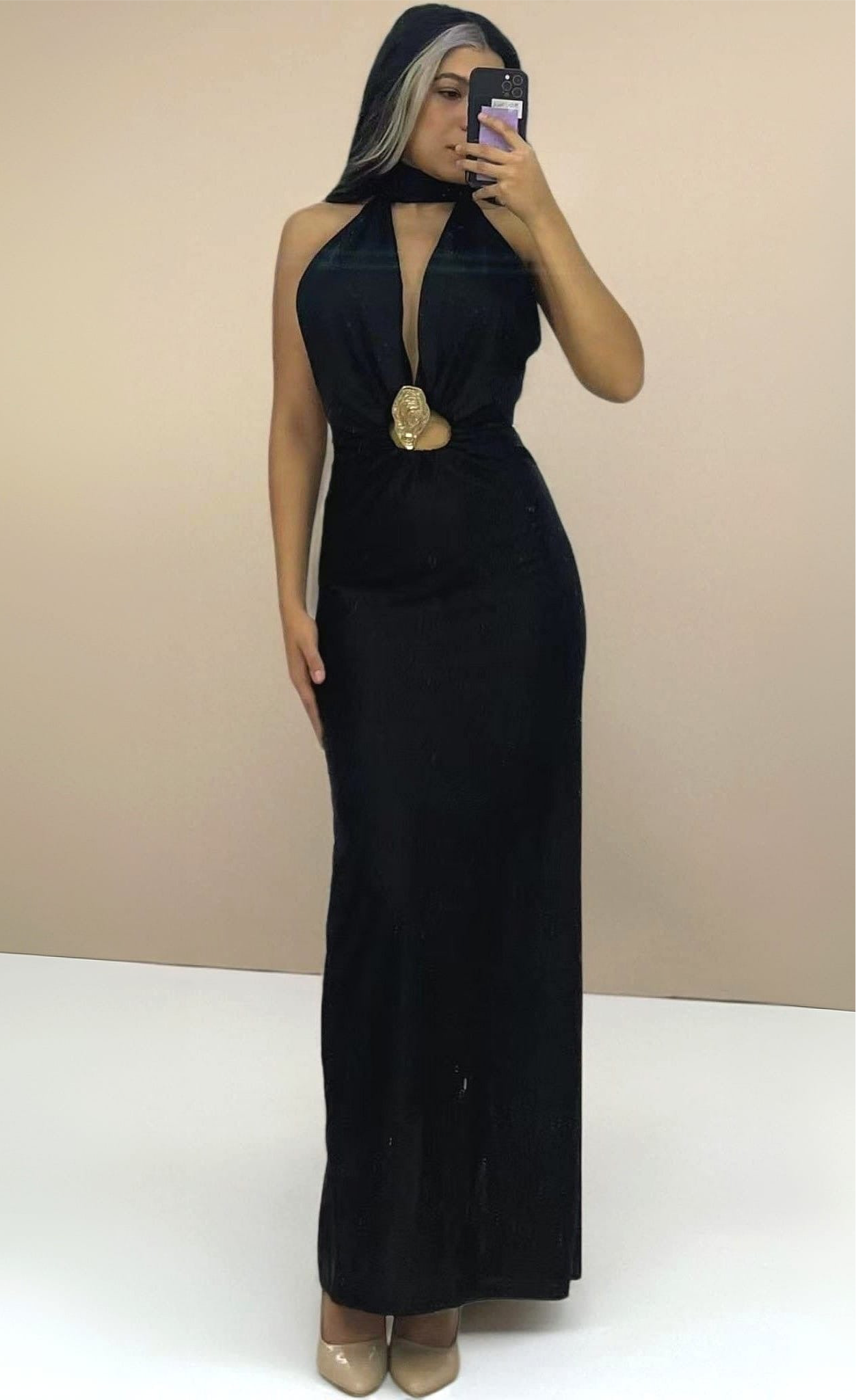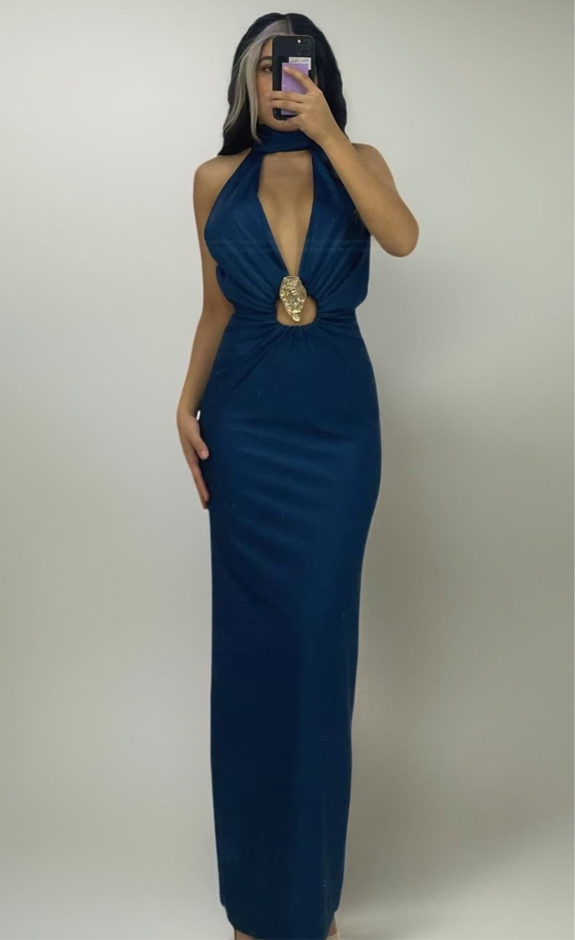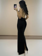 Este vestido halter es la definición del lujo y la elegancia. Con su escote profundo y su detalle de chapa dorada en el abdomen, atraerás todas las miradas. Su corte ajustado en la cintura y su buena silueta te harán sentir segura y glamorosa. Además, su satinado y espalda abierta te harán destacar en cualquier evento.