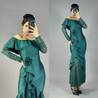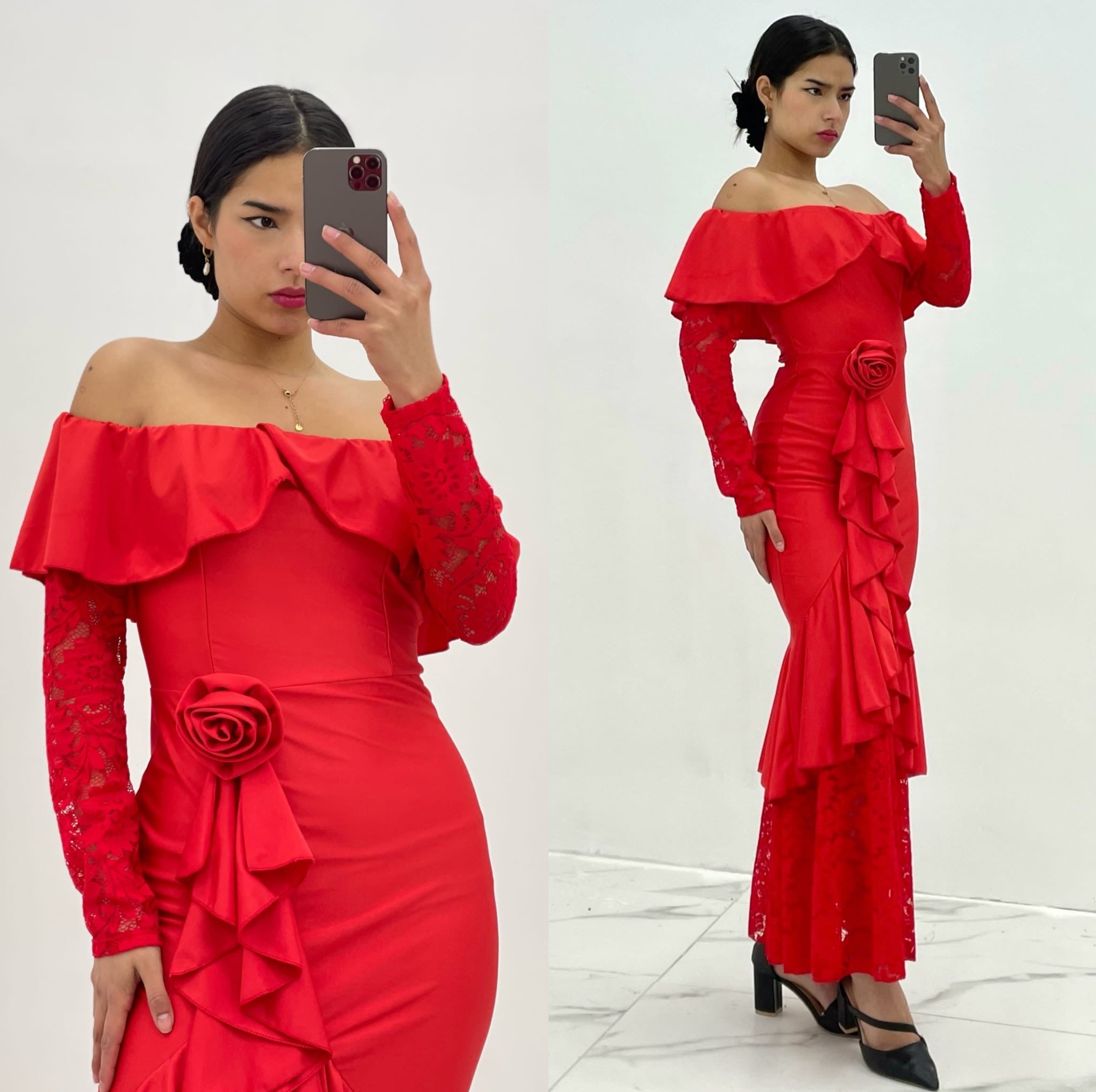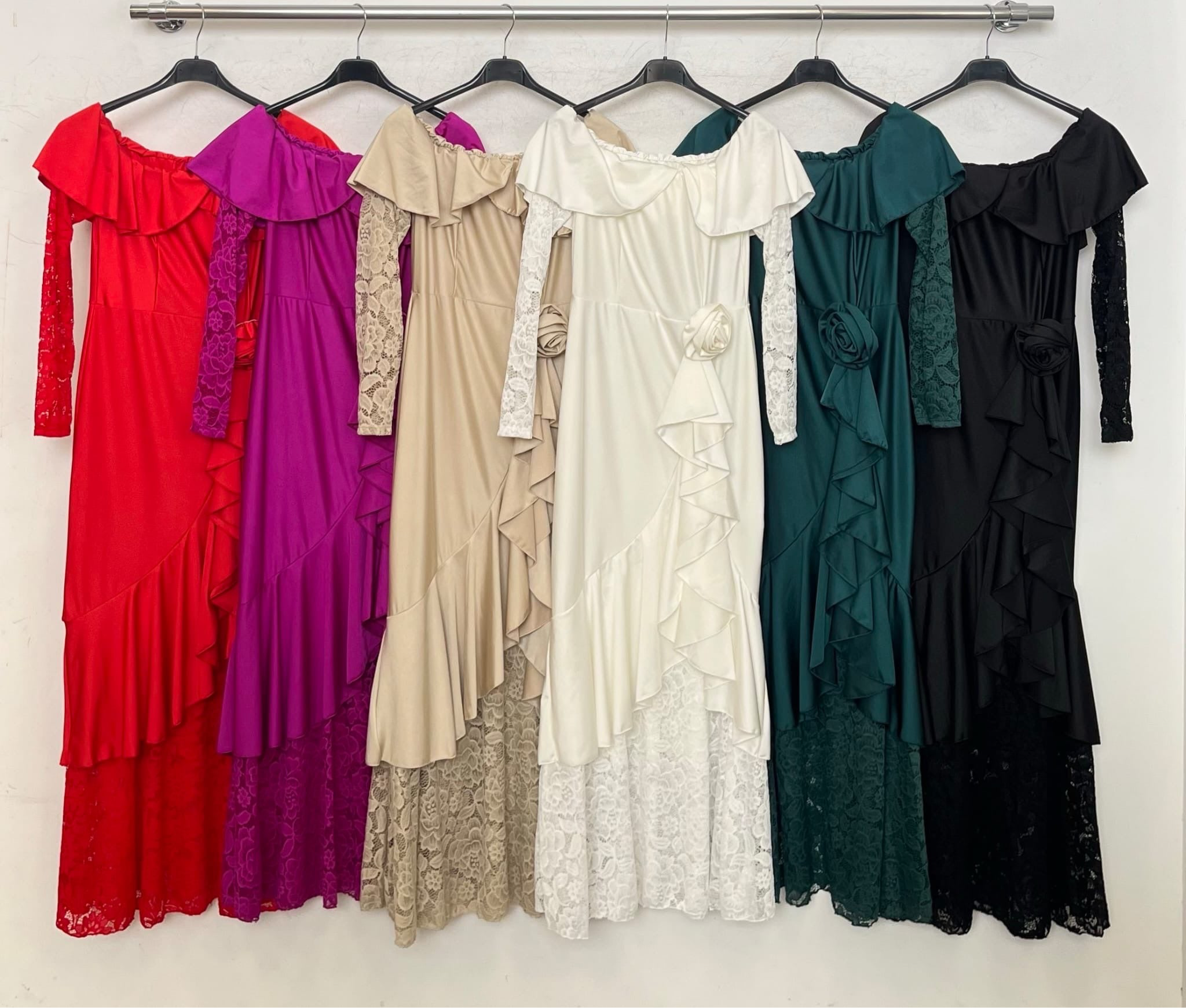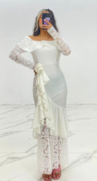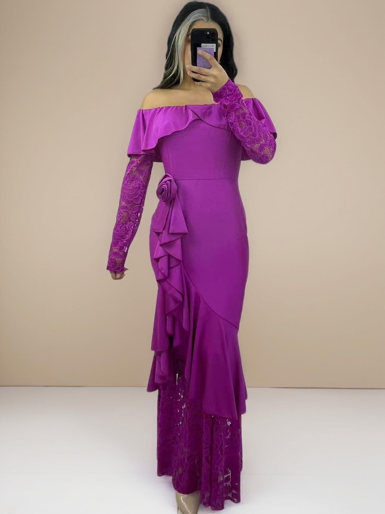 Este vestido de hombros descubiertos es tanto elegante como diferente. Con volantes y mangas de encaje, este vestido de raso es perfecto para cualquier ocasión especial. Además, viene adornado con una hermosa rosa que añade un toque de sofisticación. Se sentirá como una verdadera obra de arte al usarlo.